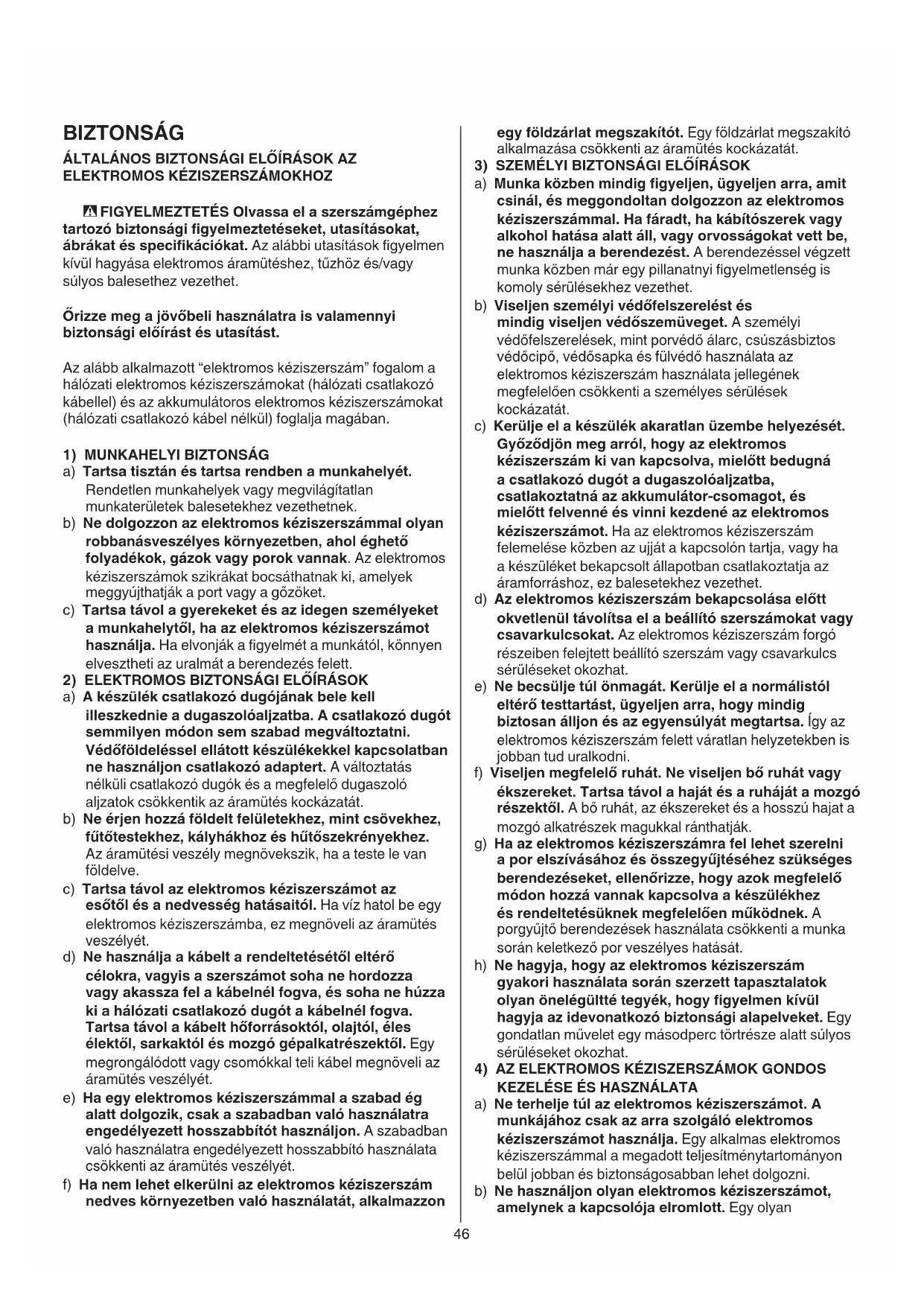 a) Az elektromos kéziszerszámot csak szakképzett személyzet és csak eredeti pótalkatrészek felhasználásával javíthatja. Ez biztosítja, hogy az elektromos kéziszerszám biztonságos szerszám maradjon. BIZTONSÁGI UTASÍTÁSOK TÖBBFUNKCIÓS