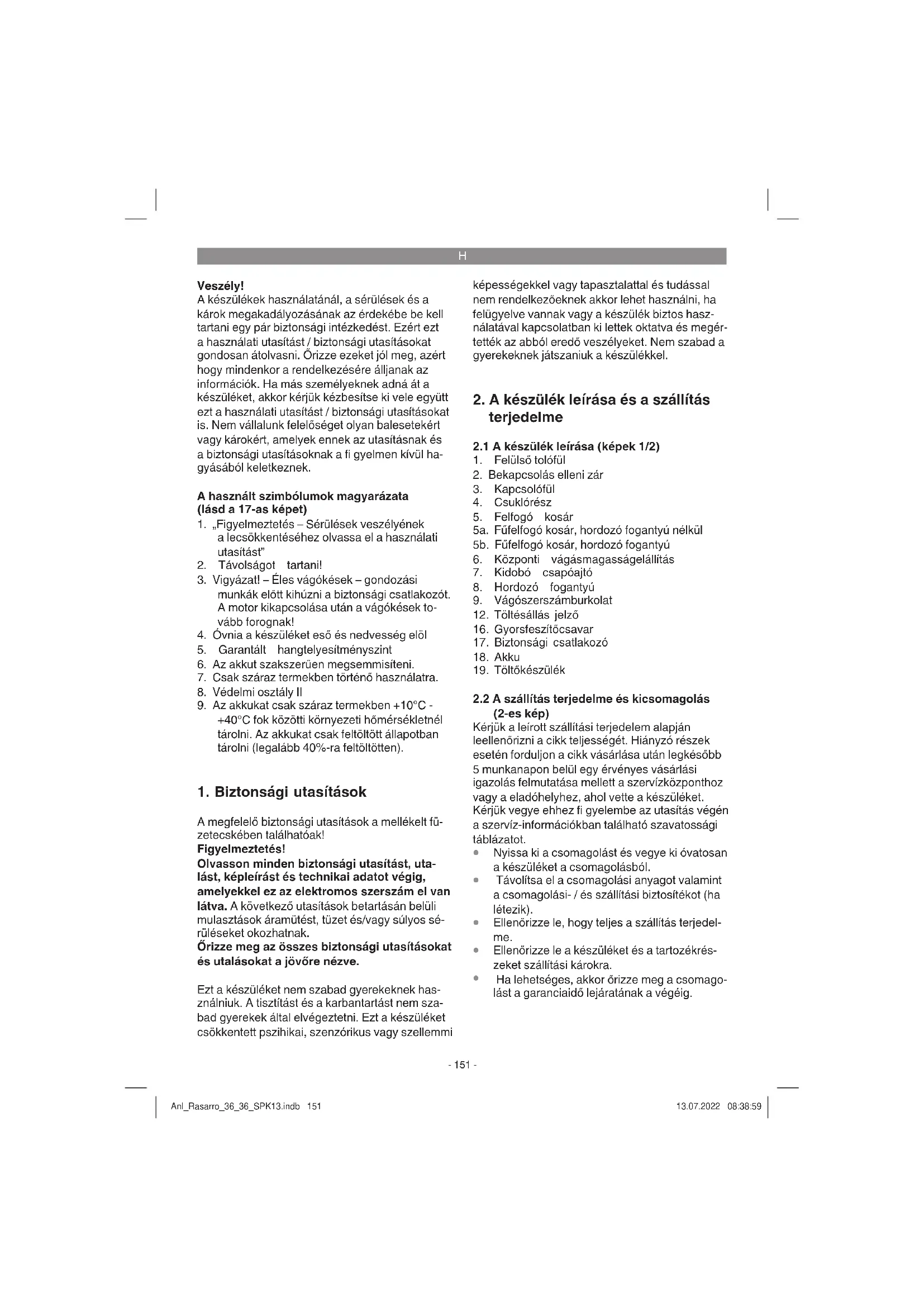 újrahasznosítás A szállítási károk megakadályozásához a készü- lék egy csomagolásban található. Ez a csoma- golás nyersanyag és ezáltal ismét felhasználható vagy pedig visszavezethető a nyersanyagi körforgáshoz. A készülék és annak a tartozé- kai különböző anyagokból állnak, mint például fémből és műanyagokból. Defektes készülékek nem tartoznak a házi hulladékok közé. Szakszerű megsemmisítéshez le kellene adni a készüléket egy megfelelő gyűjtőhelyen. Ha nem ismer gyűjtőhelyeket, akkor érdeklődjön ütánna a köz- ségi önkormányzatnál. Anl_Rasarro_36_36_SPK13.indb 157Anl_Rasarro_36_36_SPK13.indb 157 13.07.2022 08:39:0113.07.2022 08:39:01H