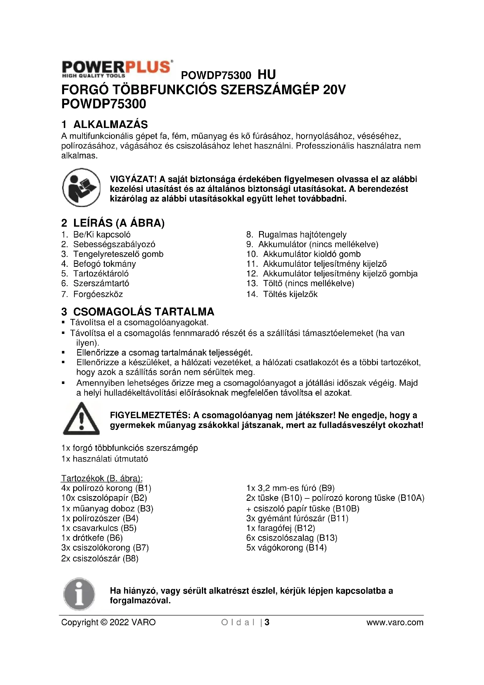 10.3 Sebesség beállítása (A. Ábra) ................................................................................ 10POWDP75300 HU Copyright © 2022 VARO O l d a l | 2 www.varo.com