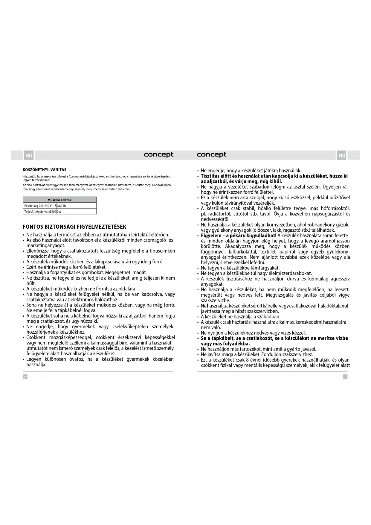 Köszönjük, hogy megvásárolta ezt a Concept márkájú készüléket, és kívánjuk, hogy használata során végig elégedett legyen termékünkkel. Az első használat előtt gyelmesen tanulmányozza át az egész használati útmutatót, és őrizze meg. Gondoskodjon róla, hogy a terméket kezelő valamennyi személy megismerje az útmutató tartalmát. Műszaki adatok Feszültség 220-240 V ~ 50/60 Hz Teljesítményfelvétel 2000 W