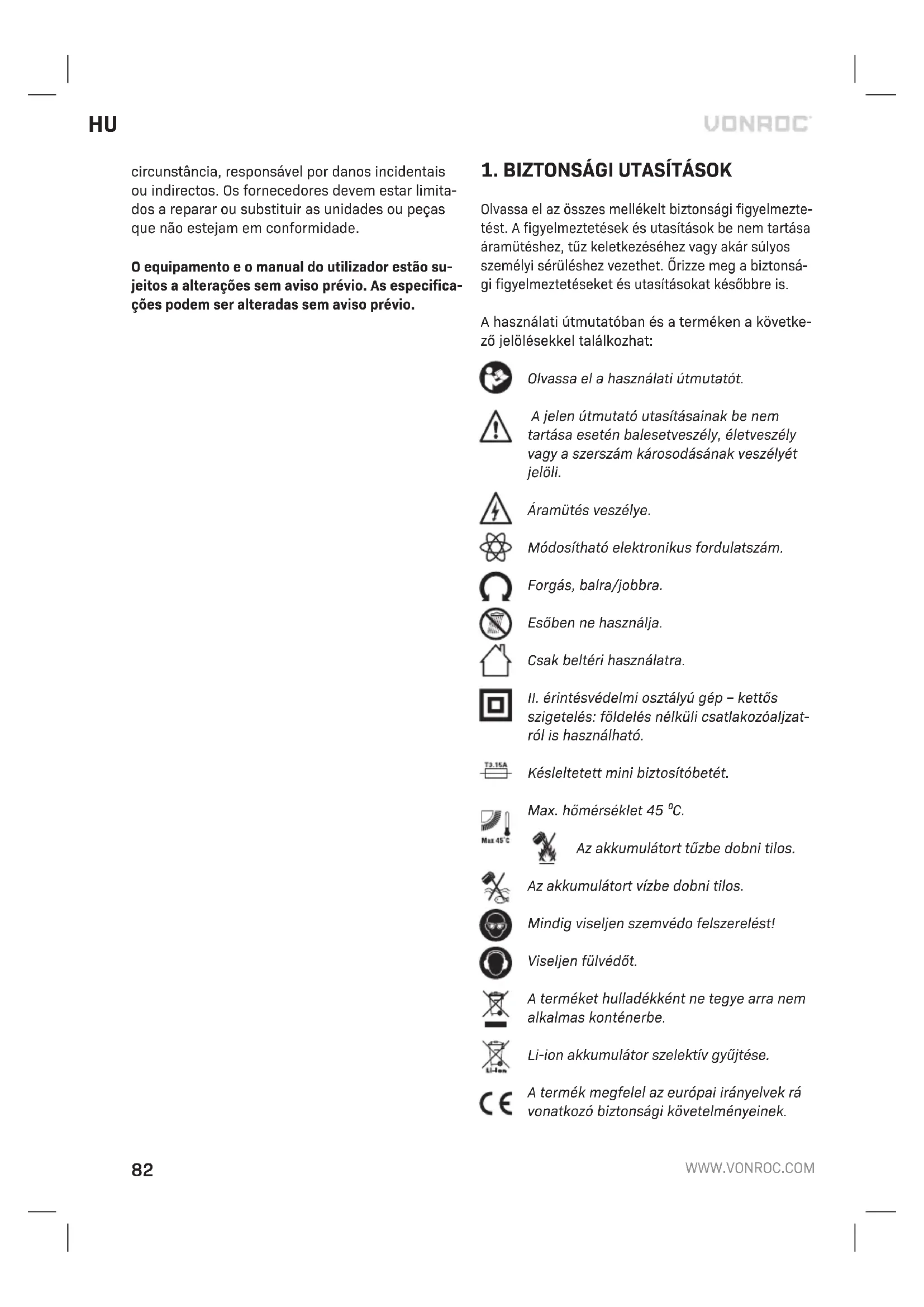 szigetelés: földelés nélküli csatlakozóaljzat- ról is használható. Késleltetett mini biztosítóbetét. Max. hőmérséklet 45 ⁰C. Az akkumulátort tűzbe dobni tilos. Az akkumulátort vízbe dobni tilos. Mindig viseljen szemvédo felszerelést! Viseljen fülvédőt. A terméket hulladékként ne tegye arra nem alkalmas konténerbe. Li-ion akkumulátor szelektív gyűjtése. A termék megfelel az európai irányelvek rá vonatkozó biztonsági követelményeinek.HU