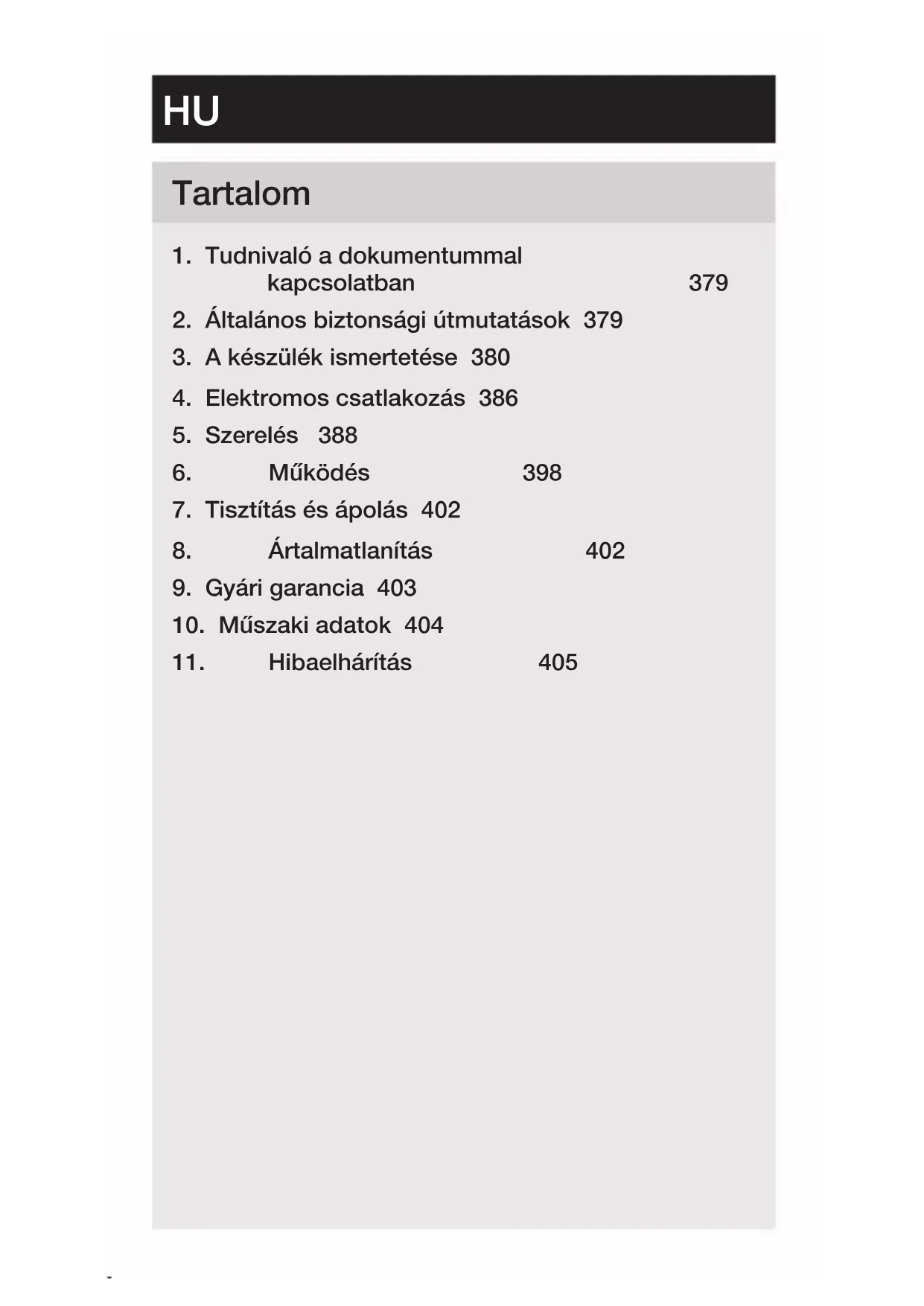 - Csatlakoztassa a hálózati vezetéket a kapcsolási rajz szerint. ➔ „4. Elektromos csatlakozás”.HU – 397 – Tartalom