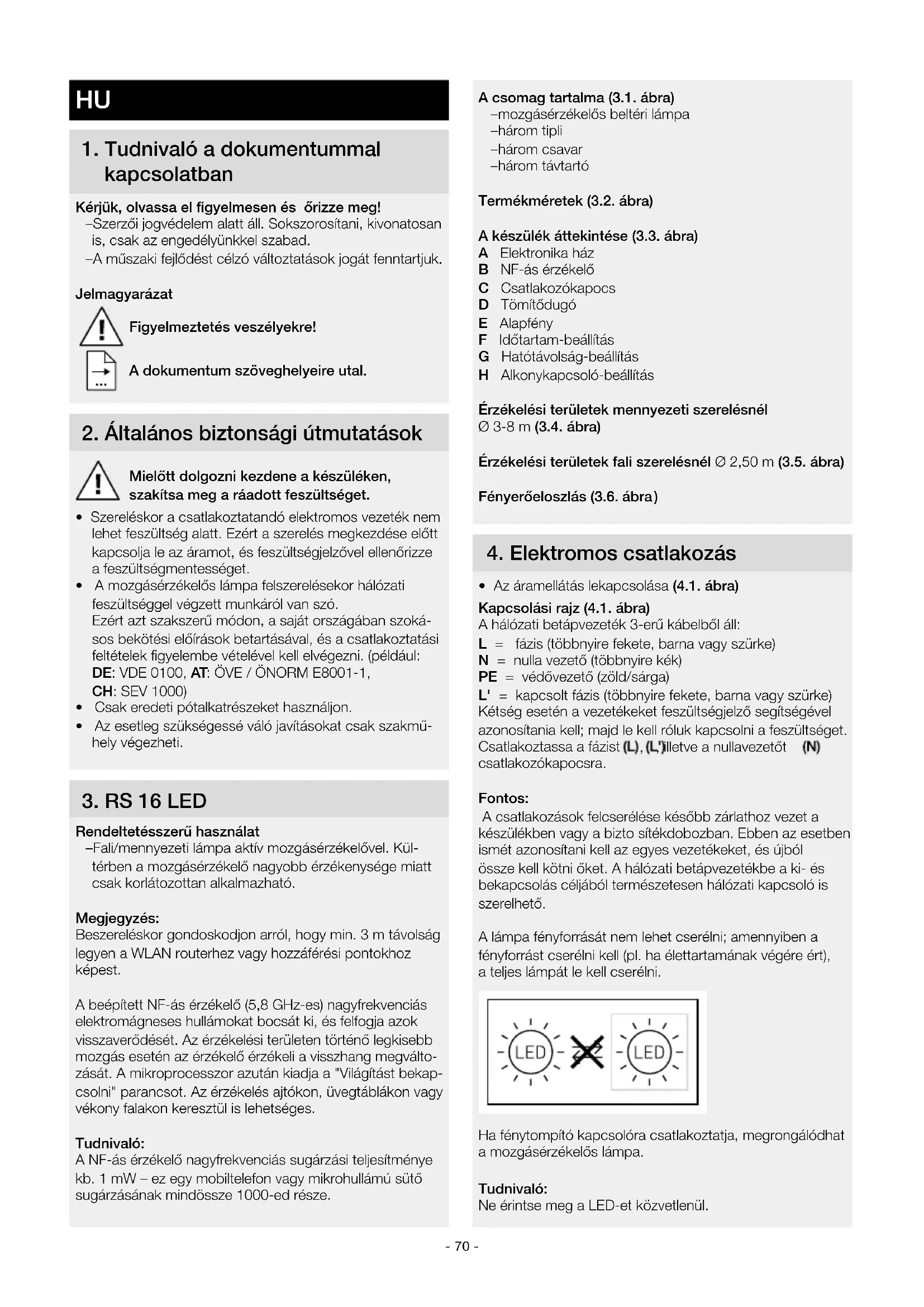 Rendeltetésszerű használat – Fali/mennyezeti lámpa aktív mozgásérzékelővel. Kül- térben a mozgásérzékelő nagyobb érzékenysége miatt csak korlátozottan alkalmazható. Megjegyzés: Beszereléskor gondoskodjon arról, hogy min. 3 m távolság legyen a WLAN routerhez vagy hozzáférési pontokhoz képest. A beépített NF-ás érzékelő (5,8 GHz-es) nagyfrekvenciás elektromágneses hullámokat bocsát ki, és felfogja azok visszaverődését. Az érzékelési területen történő legkisebb mozgás esetén az érzékelő érzékeli a visszhang megválto- zását. A mikroprocesszor azután kiadja a "Világítást bekap- csolni" parancsot. Az érzékelés ajtókon, üvegtáblákon vagy vékony falakon keresztül is lehetséges. Tudnivaló: A NF-ás érzékelő nagyfrekvenciás sugárzási teljesítménye kb. 1 mW – ez egy mobiltelefon vagy mikrohullámú sütő sugárzásának mindössze 1000-ed része.- 71 -