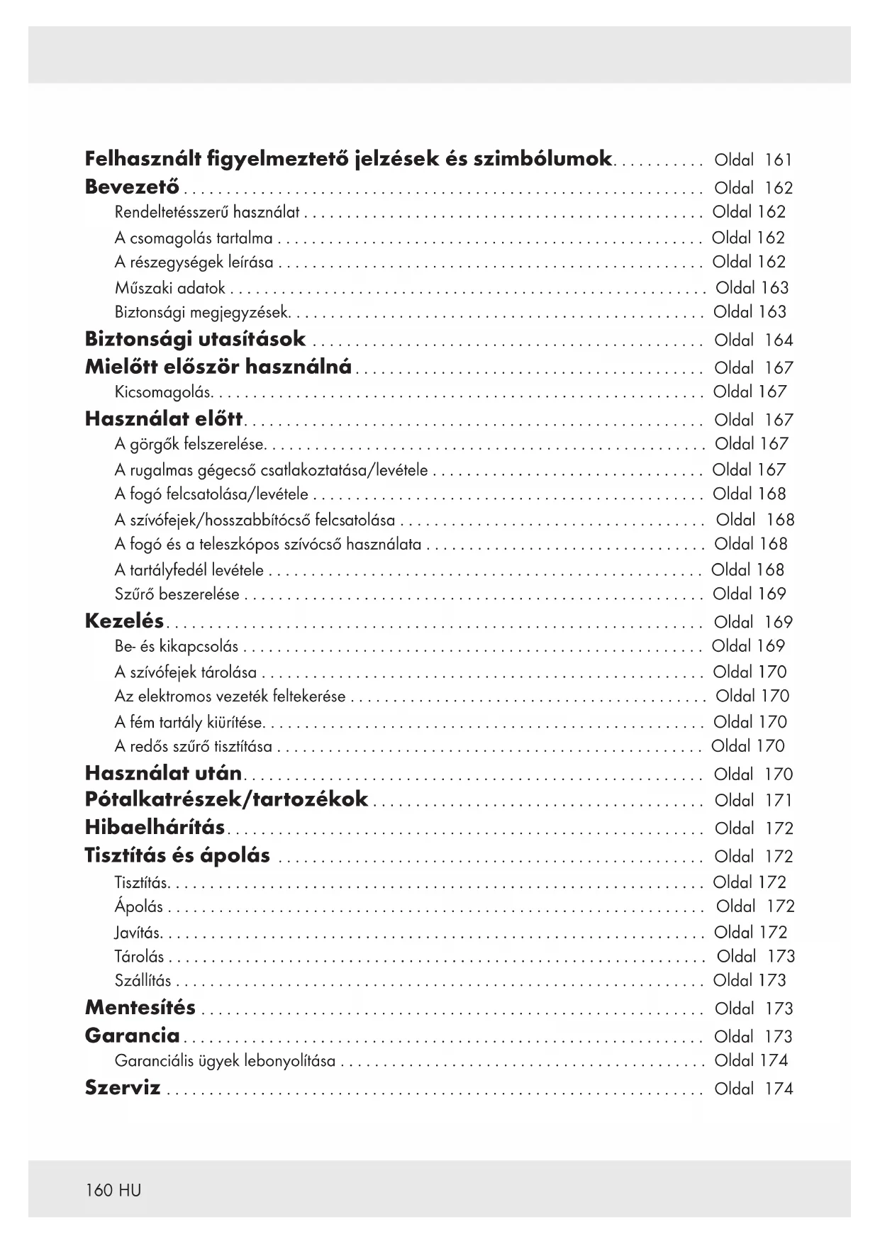 Felhasznált figyelmeztető jelzések és szimbólumok........... Oldal 161 Bevezető ............................................................. Oldal 162 Rendeltetésszerű használat ............................................... Oldal 162 A csomagolás tartalma .................................................. Oldal 162 A részegységek leírása .................................................. Oldal 162 Műszaki adatok ........................................................ Oldal 163 Biztonsági megjegyzések................................................. Oldal 163 Biztonsági utasítások .............................................. Oldal 164 Mielőtt először használná ......................................... Oldal 167 Kicsomagolás.......................................................... Oldal 167 Használat előtt...................................................... Oldal 167 A görgők felszerelése.................................................... Oldal 167 A rugalmas gégecső csatlakoztatása/levétele ................................ Oldal 167 A fogó felcsatolása/levétele .............................................. Oldal 168 A szívófejek/hosszabbítócső felcsatolása .................................... Oldal 168 A fogó és a teleszkópos szívócső használata ................................. Oldal 168 A tartályfedél levétele ................................................... Oldal 168 Szűrő beszerelése ...................................................... Oldal 169 Kezelés............................................................... Oldal 169 Be- és kikapcsolás ...................................................... Oldal 169 A szívófejek tárolása .................................................... Oldal 170 Az elektromos vezeték feltekerése .......................................... Oldal 170 A fém tartály kiürítése.................................................... Oldal 170 A redős szűrő tisztítása .................................................. Oldal 170 Használat után...................................................... Oldal 170 Pótalkatrészek/tartozékok ....................................... Oldal 171 Hibaelhárítás........................................................ Oldal 172 Tisztítás és ápolás .................................................. Oldal 172 Tisztítás............................................................... Oldal 172 Ápolás ............................................................... Oldal 172 Javítás................................................................ Oldal 172 Tárolás . . . . . . . . . . . . . . . . . . . . . . . . . . . . . . . . . . . . . . . . . . . . . . . . . . . . . . . . . . . . ... Oldal 173 Szállítás .............................................................. Oldal 173 Mentesítés ........................................................... Oldal 173 Garancia ............................................................. Oldal 173 Garanciális ügyek lebonyolítása ........................................... Oldal 174 Szerviz ............................................................... Oldal 174161