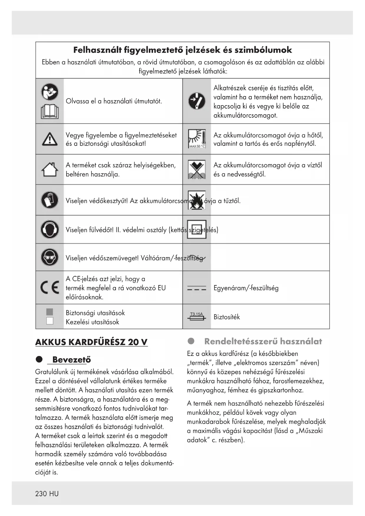 Bevezető Gratulálunk új termékének vásárlása alkalmából. Ezzel a döntésével vállalatunk értékes terméke mellett döntött. A használati utasítás ezen termék része. A biztonságra, a használatára és a meg- semmisítésre vonatkozó fontos tudnivalókat tar- talmazza. A termék használata előtt ismerje meg az összes használati és biztonsági tudnivalót. A terméket csak a leírtak szerint és a megadott felhasználási területeken alkalmazza. A termék harmadik személy számára való továbbadása esetén kézbesítse vele annak a teljes dokumentá- cióját is. Rendeltetésszerű használat Ez a akkus kardfűrész (a későbbiekben „termék”, illetve „elektromos szerszám” néven) könnyű és közepes nehézségű fűrészelési munkákra használható fához, farostlemezekhez, műanyaghoz, fémhez és gipszkartonhoz. A termék nem használható nehezebb fűrészelési munkákhoz, például kövek vagy olyan munkadarabok fűrészelése, melyek meghaladják a maximális vágási kapacitást (lásd a „Műszaki adatok” c. részben).231