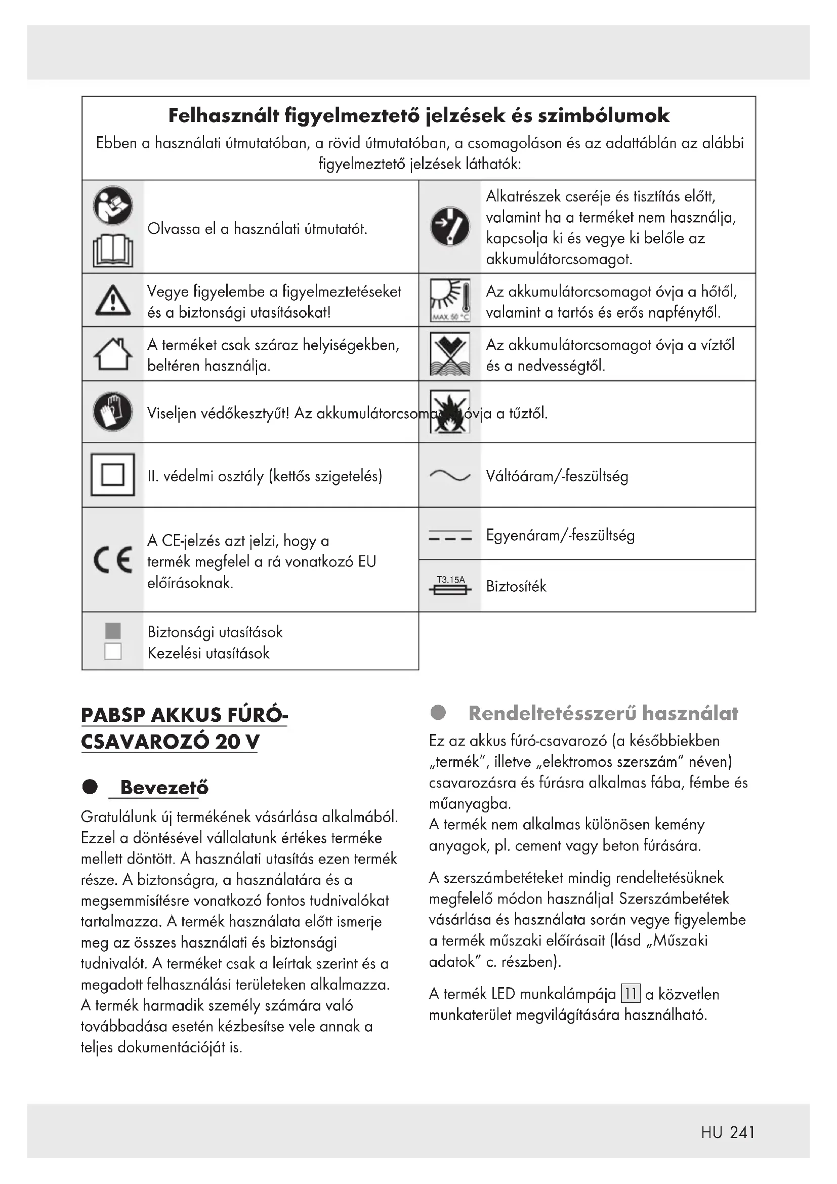Felhasznált figyelmeztető jelzések és szimbólumok Ebben a használati útmutatóban, a rövid útmutatóban, a csomagoláson és az adattáblán az alábbi figyelmeztető jelzések láthatók: Olvassa el a használati útmutatót. Alkatrészek cseréje és tisztítás előtt, valamint ha a terméket nem használja, kapcsolja ki és vegye ki belőle az akkumulátorcsomagot. Vegye figyelembe a figyelmeztetéseket és a biztonsági utasításokat! Az akkumulátorcsomagot óvja a hőtől, valamint a tartós és erős napfénytől. A terméket csak száraz helyiségekben, beltéren használja. Az akkumulátorcsomagot óvja a víztől és a nedvességtől. Viseljen védőkesztyűt! Az akkumulátorcsomagot óvja a tűztől. II.védelmi osztály (kettős szigetelés) Váltóáram/-feszültség A CE-jelzés azt jelzi, hogy a termék megfelel a rá vonatkozó EU előírásoknak. Egyenáram/-feszültség T3.15A Biztosíték Biztonsági utasítások Kezelési utasítások