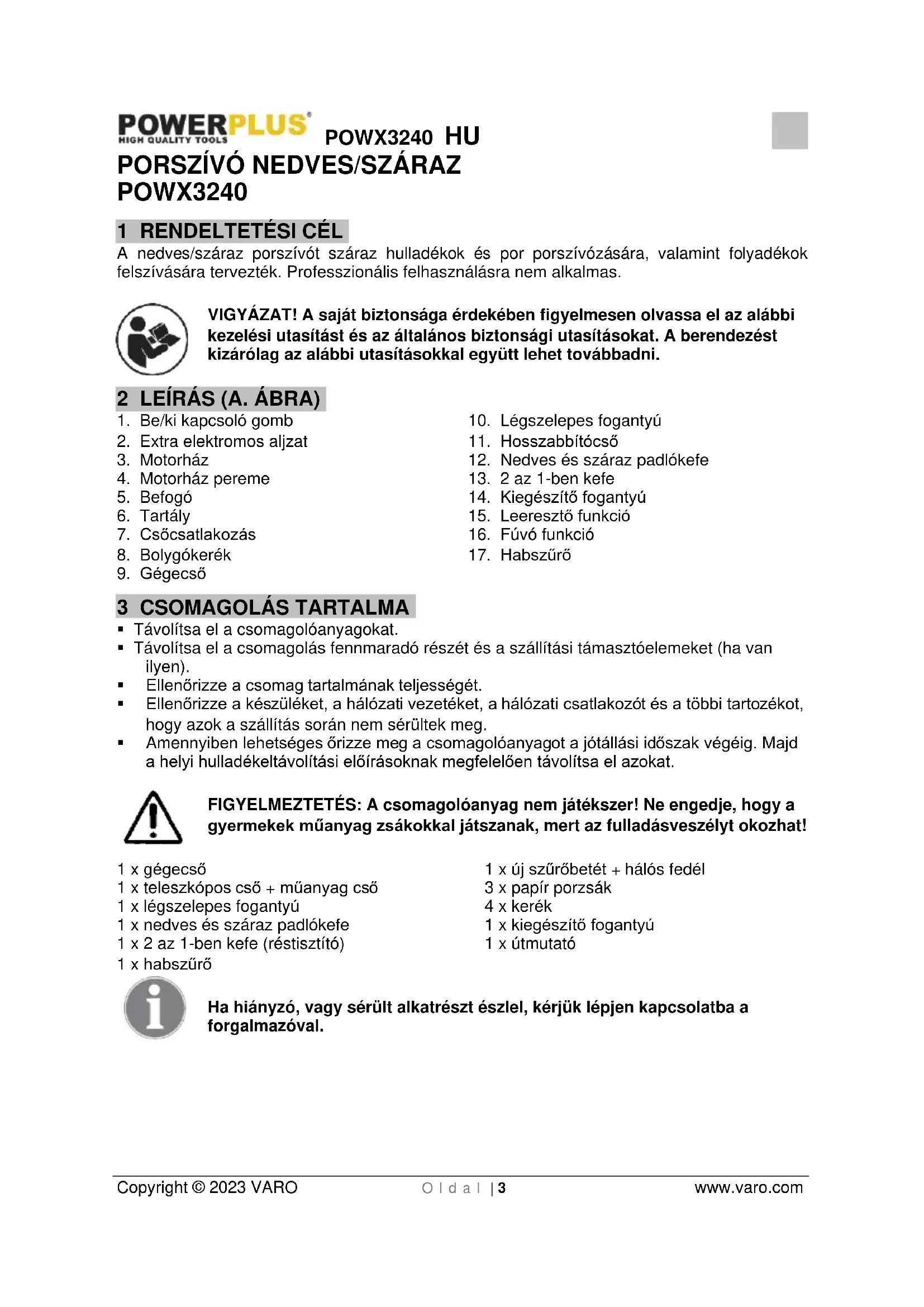 - Azok az eszközök és alkatrészek, melyek a jótállás keretében kerülnek kicserélésre, a Varo NV tulajdonát képezik.POWX3240 HU Copyright © 2023 VARO O l d a l | 10 www.varo.com