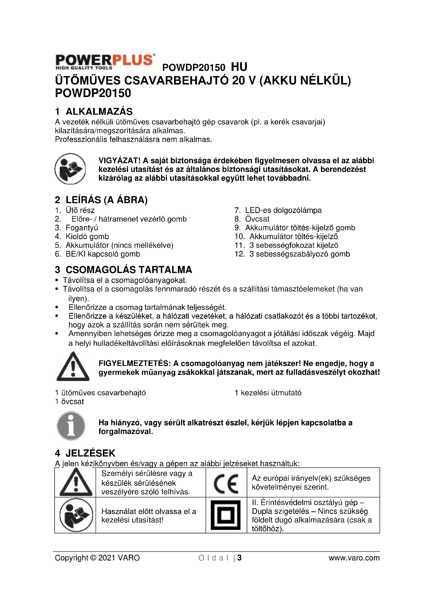 Dupla szigetelés – Nincs szükség földelt dugó alkalmazására (csak a töltőhöz).POWDP20150 HU Copyright © 2021 VARO O l d a l | 4 www.varo.com
