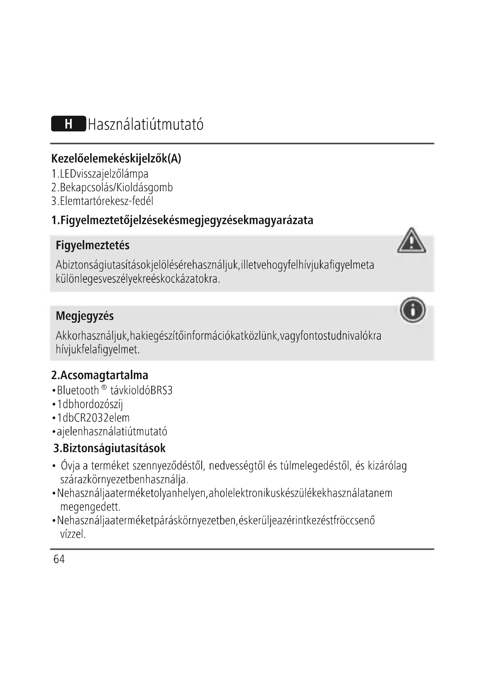 - Ne használja a terméket párás környezetben, és kerülje az érintkezést fröccsenő vízzel. H Használati útmutató65