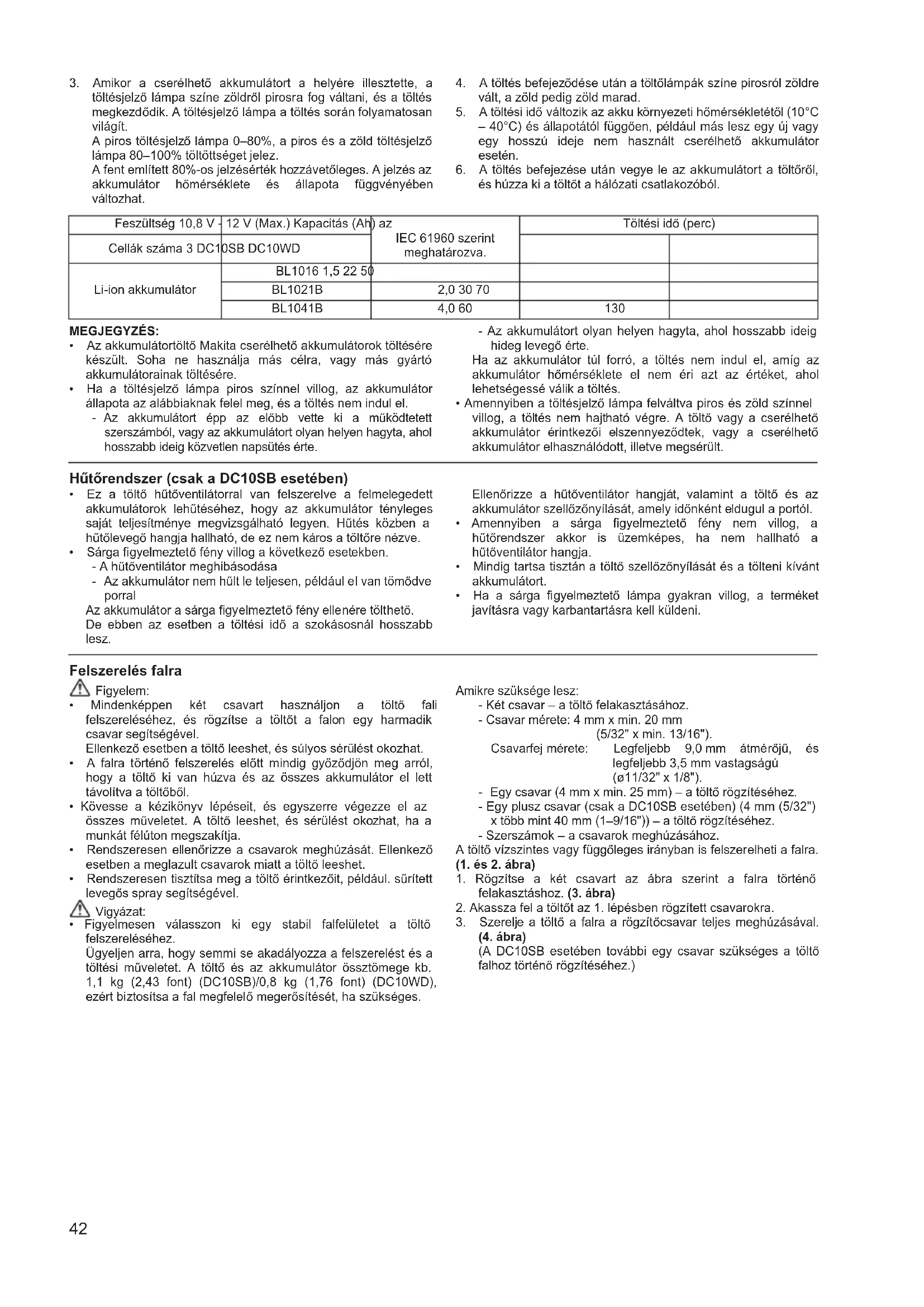 (4. ábra) (A DC10SB esetében további egy csavar szükséges a töltő falhoz történő rögzítéséhez.) Feszültség 10,8 V - 12 V (Max.) Kapacitás (Ah) az IEC 61960 szerint meghatározva. Töltési idő (perc) Cellák száma 3 DC10SB DC10WD Li-ion akkumulátor BL1016 1,5 22 50 BL1021B 2,0 30 70 BL1041B 4,0 60 13043