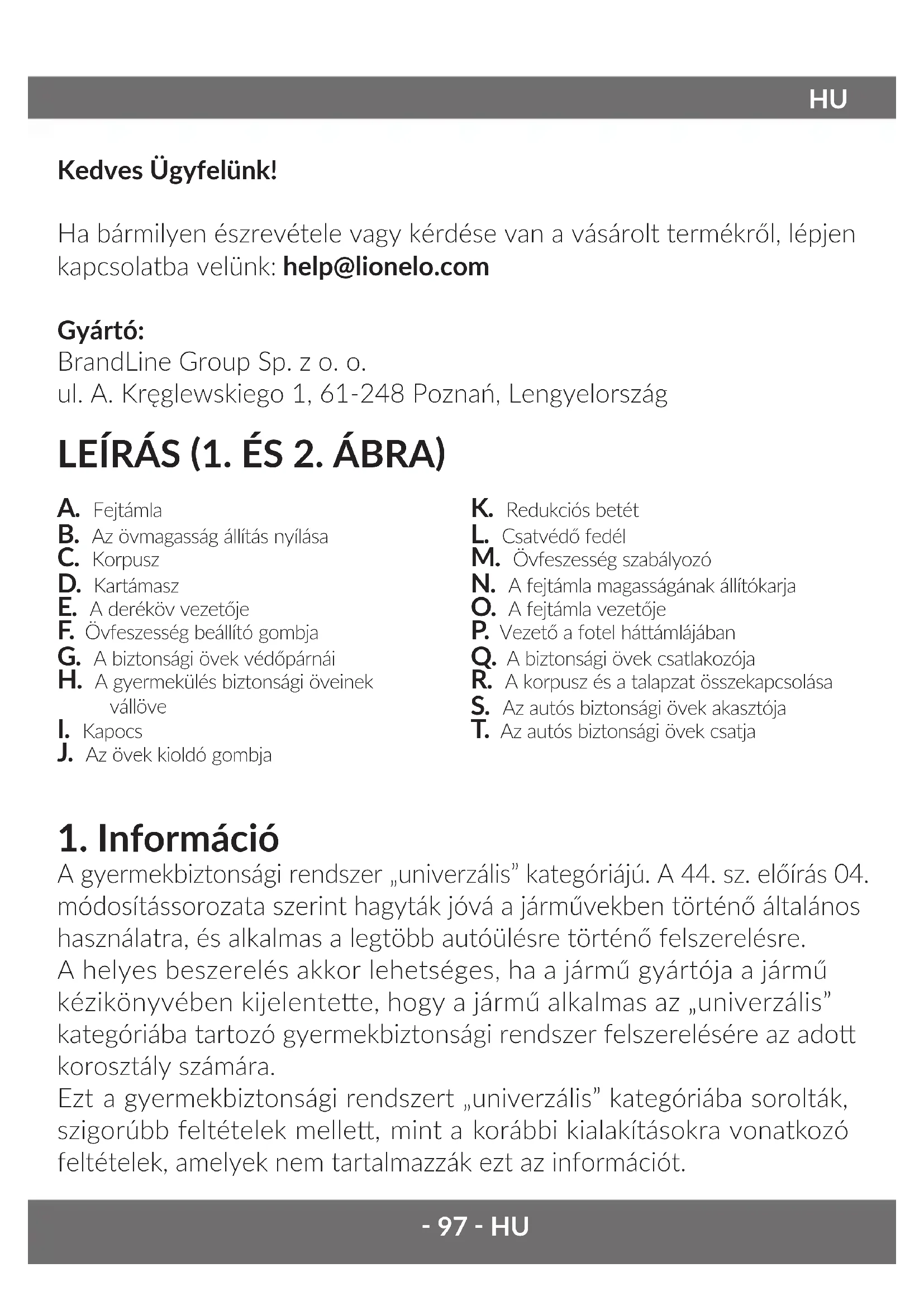 Kedves Ügyfelünk! Ha bármilyen észrevétele vagy kérdése van a vásárolt termékről, lépjen kapcsolatba velünk: help@lionelo.com Gyártó: BrandLine Group Sp. z o. o. ul. A. Kręglewskiego 1, 61-248 Poznań, Lengyelország LEÍRÁS (1. ÉS 2. ÁBRA) A. Fejtámla B. Az övmagasság állítás nyílása C. Korpusz D. Kartámasz E. A deréköv vezetője F. Övfeszesség beállító gombja G. A biztonsági övek védőpárnái H. A gyermekülés biztonsági öveinek vállöve