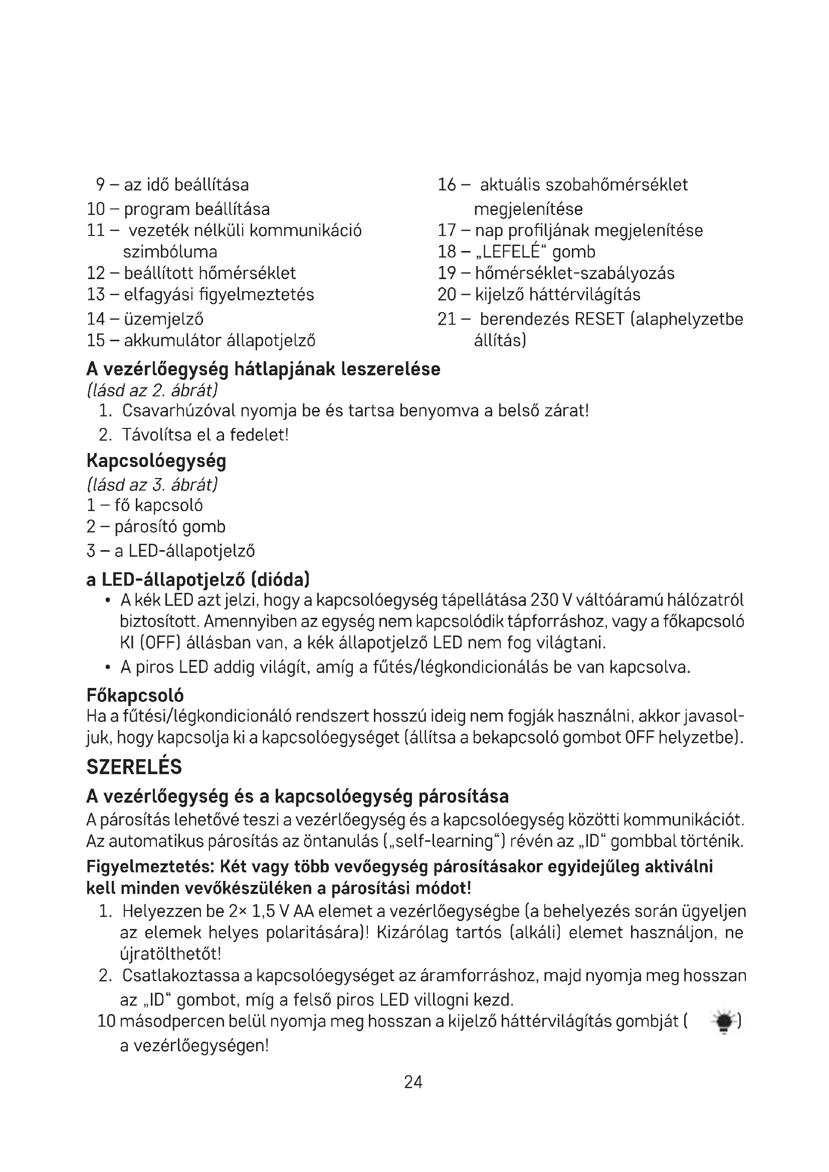 Kapcsolt terhelés: max. 230 V váltakozóáram; 16 A ellenállásos terhelés esetén; 5 A indukciós terhelés esetén Üzemi hőmérséklet-tartomány: 0°C és 40°C között Tárolási hőmérséklet: -10°C és 60°C között Egységek kapcsolata: 868 MHz-es rádiófrekvencián, 25 mW e.r.p. max. Párosítási kapacitás: legfeljebb 6 vevőegység Tápellátás: kapcsolóegység (vevő) 230 V váltakozóáram, 50 Hz Méretek és súly: kapcsolóegység: 37 × 115 × 91 mm; 150 g Vezérlőegység (hordozható) (lásd az 1. ábrát) 1 – a hét napja 2 – az idő megjelenítése 3 – komfort üzemmód 4 – gazdaságos üzemmód 5 – kézi vezérlés 6 – program előválasztás 7 – komfortos/gazdaságos üzemmód 8 – „FELFELÉ“ gomb24 9 – az idő beállítása 10 – program beállítása 11 – vezeték nélküli kommunikáció szimbóluma 12 – beállított hőmérséklet 13 – elfagyási gyelmeztetés 14 – üzemjelző 15 – akkumulátor állapotjelző 16 – aktuális szobahőmérséklet megjelenítése 17 – nap proljának megjelenítése 18 – „LEFELÉ“ gomb 19 – hőmérséklet-szabályozás 20 – kijelző háttérvilágítás 21 – berendezés RESET (alaphelyzetbe állítás) A vezérlőegység hátlapjának leszerelése (lásd az 2. ábrát)