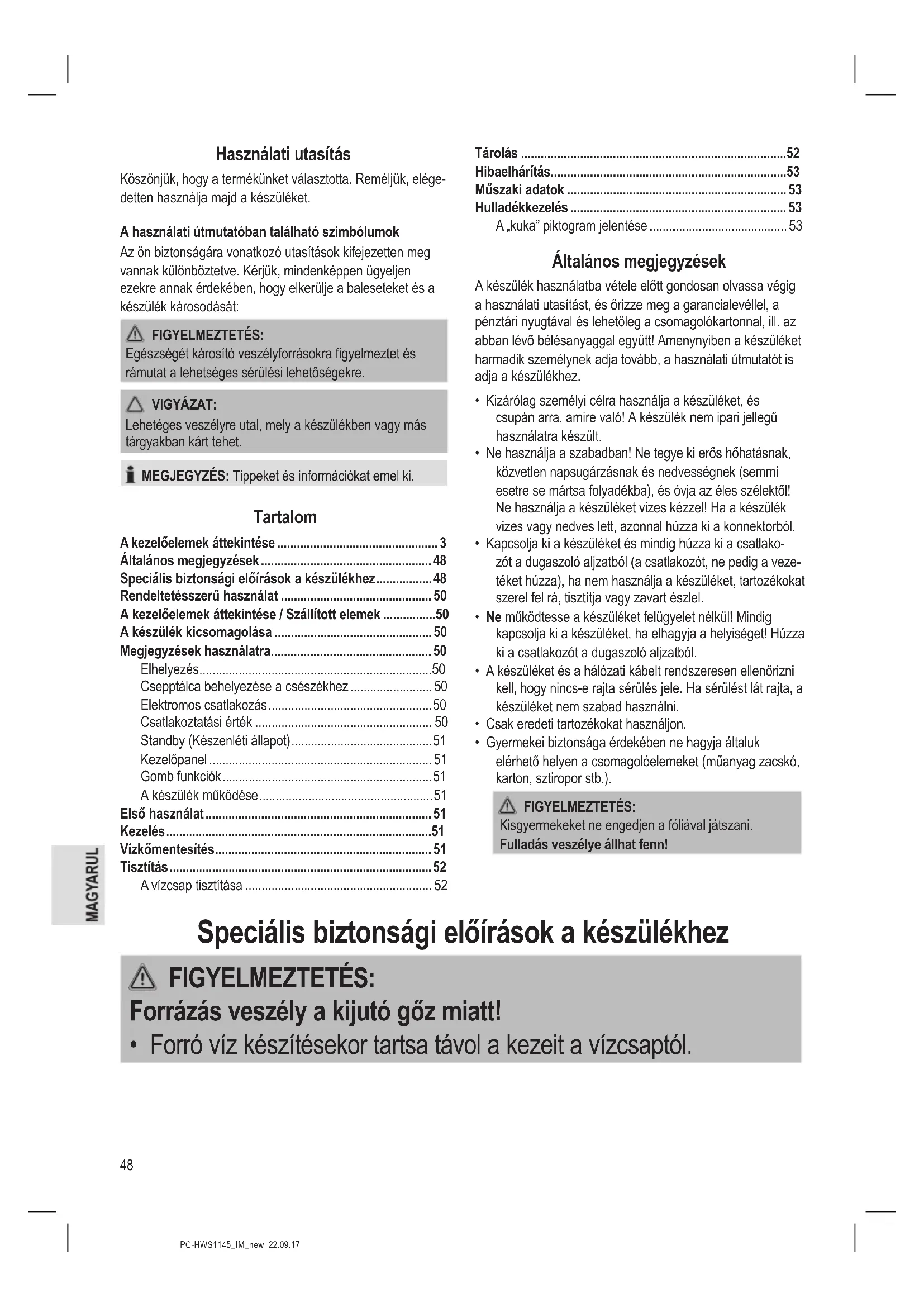 - Forró víz készítésekor tartsa távol a kezeit a vízcsaptól.49 PC-HWS1145_IM_new 22.09.17 FIGYELMEZTETÉS: Égésveszély!