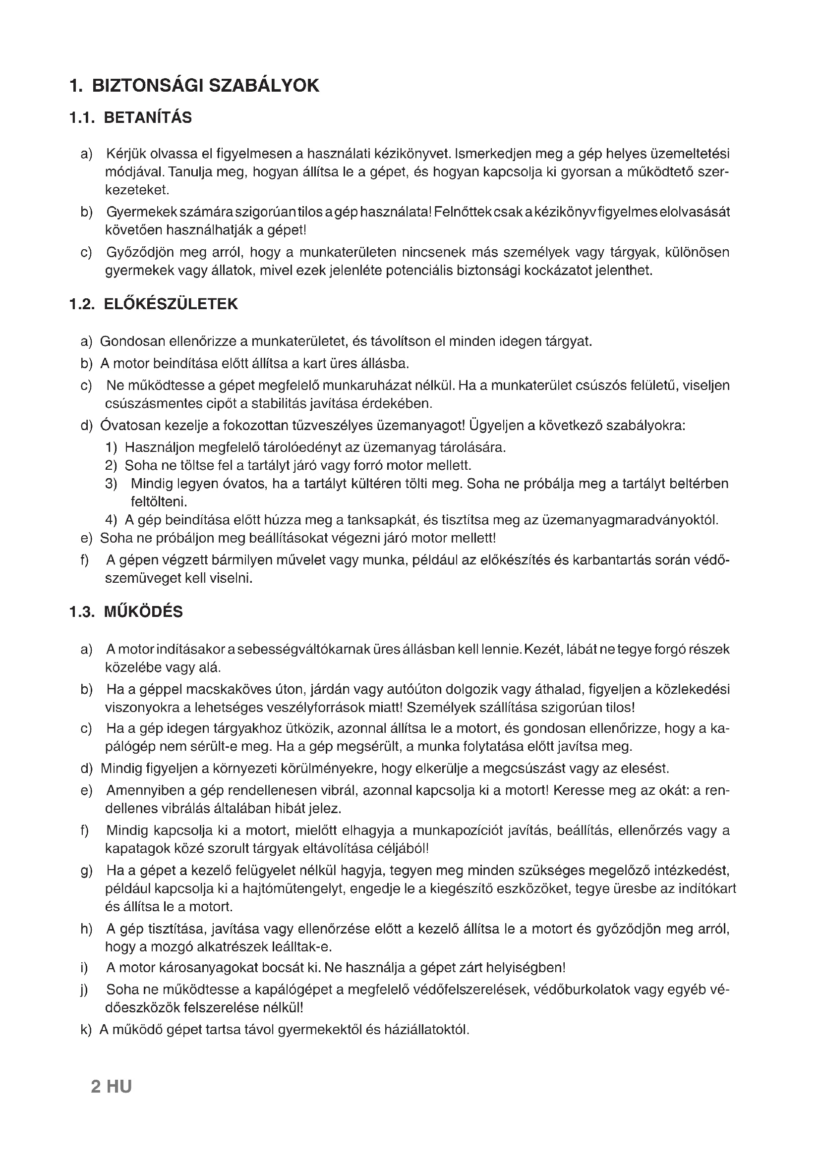 a) Gondosan ellenőrizze a munkaterületet, és távolítson el minden idegen tárgyat. b) A motor beindítása előtt állítsa a kart üres állásba. c) Ne működtesse a gépet megfelelő munkaruházat nélkül. Ha a munkaterület csúszós felületű, viseljen csúszásmentes cipőt a stabilitás javítása érdekében. d) Óvatosan kezelje a fokozottan tűzveszélyes üzemanyagot! Ügyeljen a következő szabályokra: