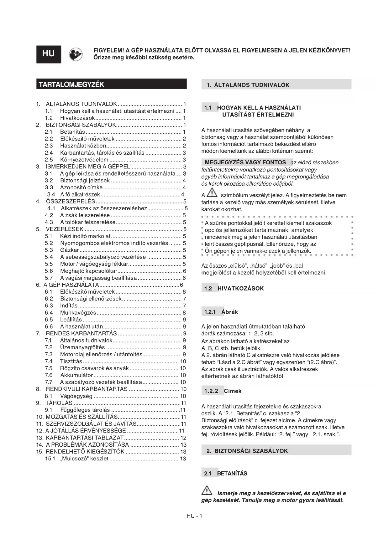 A használati utasítás fejezetekre és szakaszokra oszlik. A “2.1. Betanítás” c. szakasz a “2. Biztonsági előírások” c. fejezet alcíme. A címekre vagy szakaszokra való hivatkozásokat a számozott szak. illetve fej. rövidítések jelölik. Például: “2. fej.” vagy “ 2.1. szak.”.