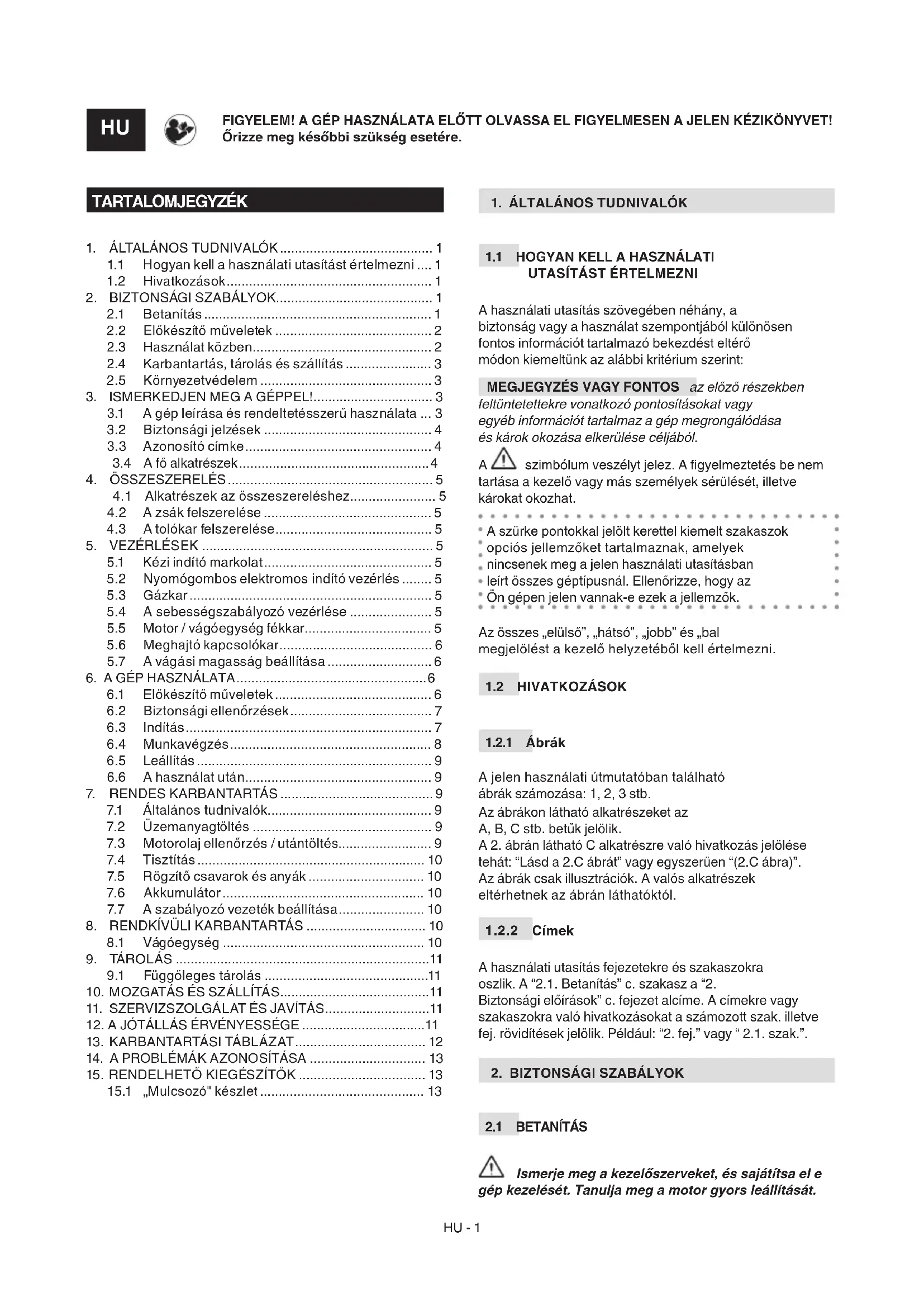 15.1 „Mulcsozó" készlet ............................................ 13HU - 2 A gyelmeztetések és az utasítások be nem tartása tűzesethez és/vagy súlyos sérülésekhez vezethet.