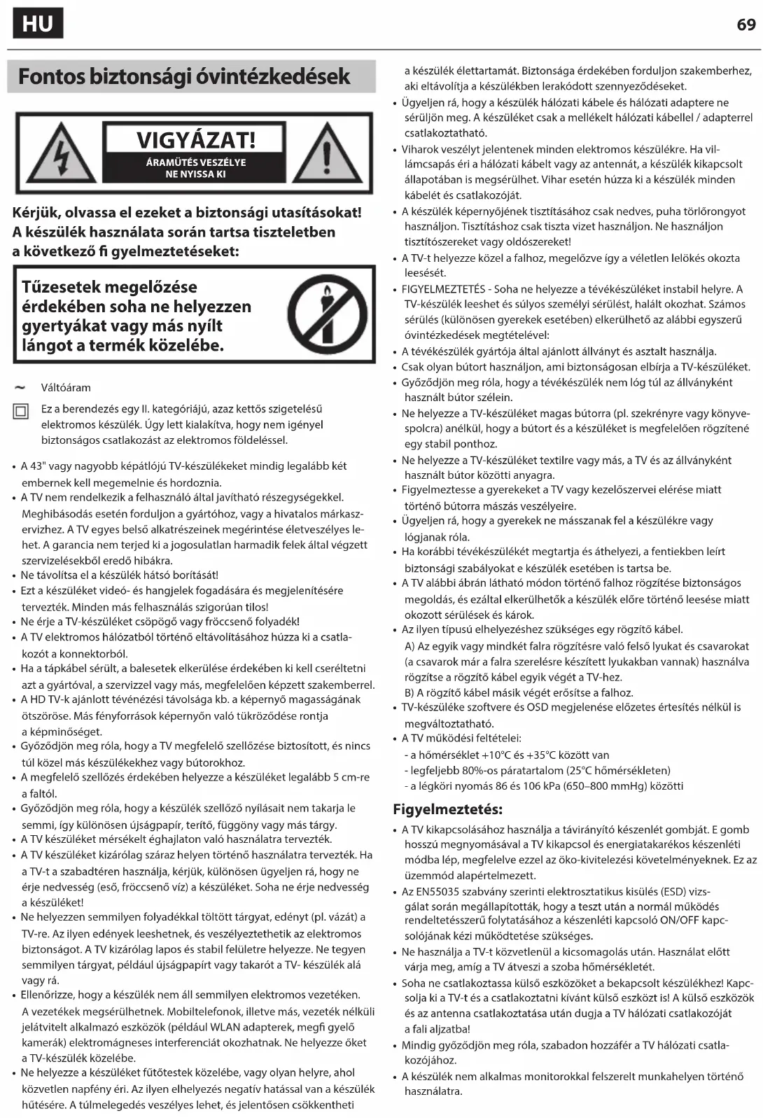 Fontos biztonsági óvintézkedések VIGYÁZAT! ÁRAMÜTÉS VESZÉLYENE NYISSA KI Kérjük, olvassa el ezeket abiztonsági utasításokat! Akészülék használata során tartsa tiszteletben akövetkező gyelmeztetéseket: Tűzesetek megelőzése érdekében soha ne helyezzen gyertyákat vagy más nyílt lángot a termék közelébe. Váltóáram Ez a berendezés egy II. kategóriájú, azaz kettős szigetelésű elektromos készülék. Úgy lett kialakítva, hogy nem igényel biztonságos csatlakozást az elektromos földeléssel.