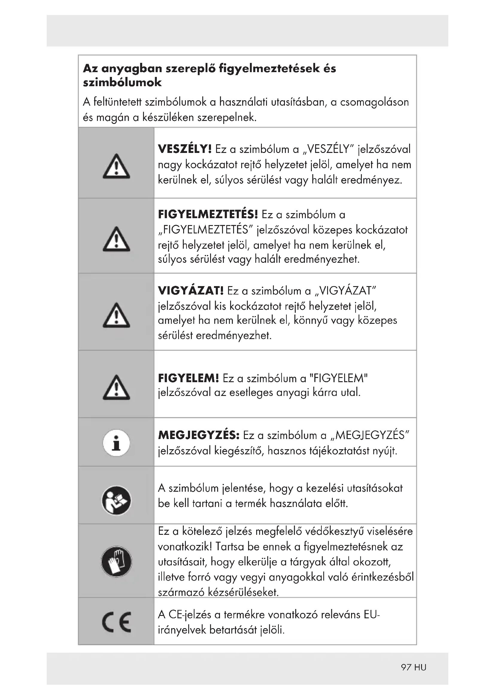 teljesen lezárják a fülét (lásd: B. ábra) Az optimális zajcsökkentés érdekében a fülvédőnek szorosan kell illeszkednie a fejhez. Csúsztassa felfelé vagy lefelé a fülvédőt, hogy megtalálja azt a pozíciót, ahol teljesen eltakarja a fülét. Megfelelő felszerelés és beállítás esetén a fülvédők nem érhetnek hozzá a fejfedő héjához vagy a napellenző szegélyéhez. Ellenőrizze a fülvédő párnáinak tömítését a szemüveg halántékot érintő részei körül. Ha nem zár jól a szemüveg körül, akkor kevésbé véd a zajoktól. Ellenőrizze az illeszkedést hangos beszéddel. A hangjának üregesnek kell hangzania, mintha egy hordóba beszélne. Az Önt körülvevő zajoknak nem szabad olyan hangosnak lenniük, mint a fülvédő felhelyezése előtt. A viselőnek biztosítania kell: A fülvédő illesztését, beállítását és karbantartását a gyártó utasításainak megfelelően A fülvédőt zajos környezetben mindig viselik102 HU A fülvédőket rendszeresen ellenőrzik a működőképesség szempontjából P Tisztítás és gondozás A tisztításhoz és ápoláshoz száraz/kissé nedves, puha és szöszmentes kendőt használjon. A fülvédő összecsukható a könnyű és kényelmes tárolás érdekében. P Tárolás A terméket száraz, pormentes helyen, és a közvetlen napfénytől védve tárolja. P Mentesítés A csomagolás környezetbarát anyagokból készült, amelyeket a helyi újrahasznosító helyeken adhat le ártalmatlanítás céljából. A hulladék elkülönítéséhez vegye figyelembe a csomagolóanyagon található jelzéseket. Ezek rövidítéseket (a) és számokat (b) tartalmaznak a következő jelentéssel: 1–7: műanyagok / 20–22: papír és karton / 80–98: kötőanyagok. A termék, és a csomagolóanyagokat is, újrahasznosítható, és a gyártó kiterjesztett felelőssége alá tartozik. A jobb hulladékkezelés érdekében az ábrán látható információk (szortírozási információk) alapján külön ártalmatlanítsa őket. A Triman-logó csak Franciaországra vonatkozik. A kiszolgált termék megsemmisítési lehetőségeiről lakóhelye illetékes önkormányzatánál tájékozódhat.103 HU P Egyszerűsített EU-megfelelőségi nyilatkozat Az OWIM GmbH & Co. KG, Stiftsbergstraße 1, 74167 Neckarsulm, NÉMETORSZÁG kijelenti, hogy a termék GYERMEK HALLÁSVÉDŐ FÜLTOK HG04131D/HG04131E, megfelel az (EU) 2016/425 rendeletnek. Az EU-megfelelőségi nyilatkozat teljes szövege elérhető a következő internetes címen: www.owim.com Kérjük, írja be a cikkszámot (419661_2201 - a terméken látható). P Garancia és szerviz P Garancia A terméket szigorú minőségi előírások betartásával gondosan gyártottuk, és szállítás előtt lelkiismeretesen ellenőriztük. Ha a terméken hiányosságot tapasztal, akkor a termék eladójával szemben törvényes jogok illetik meg Önt. Ezeket a törvényes jogokat a következőkben ismertetett garancia vállalásunk nem korlátozza. A termékre 3 év garanciát adunk a vásárlás dátumától számítva. A garanciális idő a vásárlás dátumával kezdődik. Kérjük, jól őrizze meg a pénztári blokkot. Ez a bizonylat szükséges a vásárlás tényének az igazolásához. Ha a termék vásárlásától számított 3 éven belül anyag- vagy gyártási hiba merül fel, akkor a választásunk szerint a terméket ingyen megjavítjuk vagy kicseréljük. A garancia megszűnik, ha a terméket megrongálták, nem szakszerűen kezelték vagy tartották karban. A garancia az anyag- vagy gyártáshibákra vonatkozik. A garancia nem terjed ki azokra a termékrészekre, melyek normál kopásnak vannak kitéve és ezért fogyóeszköznek tekinthetők (pl. elemek), vagy a törékeny részekre sérülésére, pl. kapcsolók, akkuk, vagy üvegből készült részek. P Garanciális ügyek lebonyolítása Ügyének gyors elintézhetősége céljából, kérjük kövesse az alábbi útmutatást: Kérjük, kérdések esetére készítse elő a pénztárblokkot és a cikkszámot (IAN 419661_2201) a vásárlás tényének az igazolására.104 HU Kéjük, hogy a cikkszámot olvassa le a típustábláról, a gravírozásból, az Útmutató címoldaláról (balra lent), illetve a hátoldalon, vagy a termék alján található matricáról. Amennyiben működési hibák, vagy egyéb hiányosság lépne fel, előszöris vegye fel a kapcsolatot a következőkben megnevezett szervizek egyikével telefonon, vagy e-mailen. A hibásnak ítélt terméket ezután a vásárlást igazoló blokk, valamint a hiba leírásának és keletkezési idejének mellékelésével díjmentesen postázhatja az Önnel közölt szervizcímre. P Szerviz Szerviz Magyarország Tel.: 06 80021536 E-mail: owim@lidl.hu105 SI Uporabljena opozorila in simboli ...............................Stran 106 Uvod ........................................................................................Stran 107 Namenska uporaba ..............................................................Stran 107 Opis delov .............................................................................Stran 107 Tehnični podatki ....................................................................Stran 108 Obseg dobave ......................................................................Stran 109 Varnostna navodila ..........................................................Stran 109 Navodila za nameščanje ................................................Stran 110 Čiščenje in nega ..................................................................Stran 111 Shranjevanje ........................................................................Stran 111 Odstranjevanje ...................................................................Stran 111 Poenostavljena izjava EU o skladnosti ....................................................................Stran 111 Garancija in servis ....................................................
