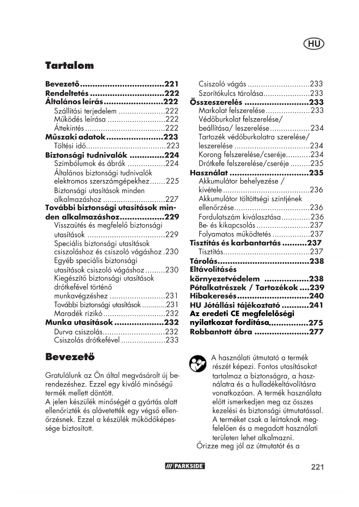 Biztonsági tudnivalók FIGYELEM!Villamos szerszámok használatasoránazáramütés,a sérülés-ésatűzveszélyellenivéde- lemérdekébenkövetkezőalapvető biztonságiintézkedéseketkellgye- lembe venni. Azelektromoskéziszerszámhasz- nálataelőtt,olvassaelezeketaz utasításokat,ésjólőrizzemega biztonsági utasításokat. Szimbólumok és ábrák A készüléken található képjelek: EzakészülékaParksideX 20VTEAMsorozatrésze Akezelésiutasítástelkellolvasni! Viseljen szem Elektromosgépeknemtartoznaka háztartásihulladékba Orsóreteszelőgomb Korong mozgásiránya „Bekapcsolás”irányjelzőnyíl A vágókorongon lévő további szimbólumok: Nem használható nedves csiszolásra Ne használjon hibás korongot Nem használható oldal-csiszolásra fémmegmunkálásratervezték Viseljenfülvédőt Viseljen maszkot Vágásisérülésekmiattiveszély!Vi- seljenvágásbiztoskesztyűket Viseljenvédőcipőt225