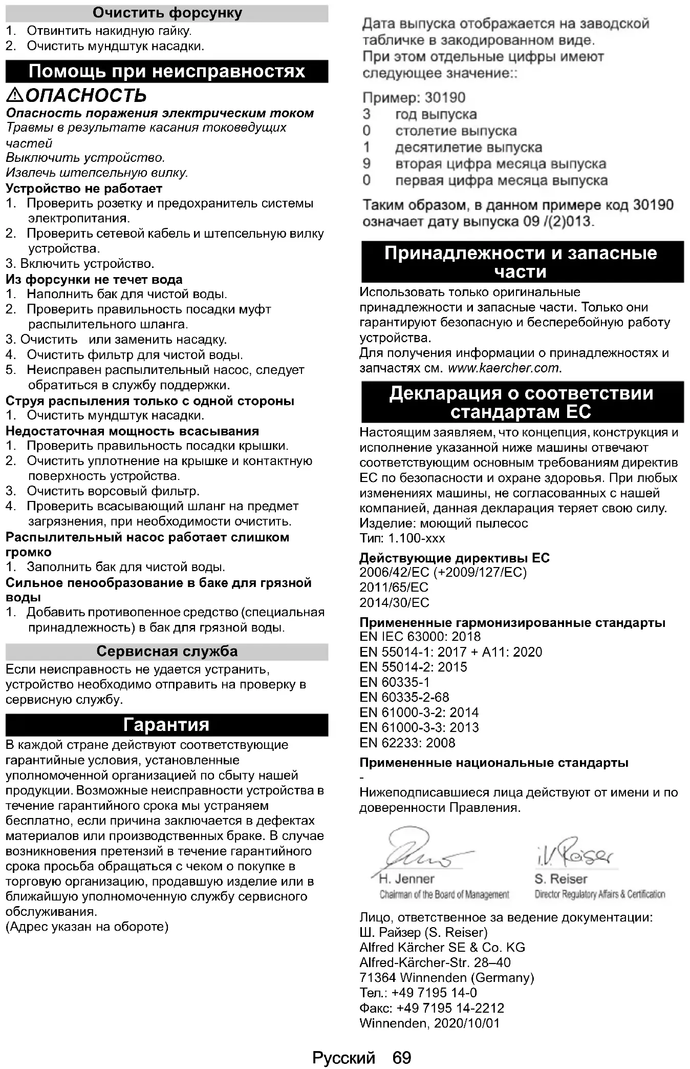 6.295-850.0 CarpetPro tisztí- tószer, gyorsan száradó (10 liter) RM 767 fo- lyékony 1,2 % 6.295-198.0 CarpetPro tisztí- tószer (10 liter) RM 764 fo- lyékony 1 % 6.295-854.0 CarpetPro imp- regnálószer (5 li- ter) RM 762 fo- lyékony 20 % 6.295-852.0 Habzásgátló (2,5 liter) RM 761 fo- lyékony 0,5 % 6.291-389.074 Magyar Garancia Minden országban az illetékes értékesítő társaságunk által megadott garanciális feltételek vannak érvényben. A készüléknél felmerülő esetleges zavarokat a garanci- aidőn belül díjmentesen orvosoljuk, amennyiben anyag- , illetve gyártási hibáról van szó. Garanciális esetben kérjük, a számlával együtt forduljon kereskedőjéhez vagy a legközelebbi, arra jogosult ügyfélszolgálati iro- dához. (A címet lásd a hátoldalon) Tartozékok és pótalkatrészek Csak eredeti tartozékot és eredeti pótalkatrészt alkal- mazzon; ezek garantálják a készülék biztonságos és zavarmentes üzemelését. A tartozékokra és pótalkatrészekre vonatkozóan infor- mációkat itt talál: www.kaercher.com. EU-megfelelőségi nyilatkozat Ezúton kijelentjük, hogy az alább megjelölt gép tervezé- se és felépítése alapján, valamint az általunk forgalom- ba hozott kivitelben megfelel a vonatkozó EU- irányelvek alapvető biztonsági és egészségügyi köve- telményeinek. A gépen végzett, de velünk nem egyez- tetett módosítás esetén jelen nyilatkozat érvényét veszti. Termék: Szóróextrakciós készülék Típus: 1.100-xxx Vonatkozó EU-irányelvek 2006/42/EK (+2009/127/EK) 2011/65/EU irányelv 2014/30/EU irányelv Alkalmazott harmonizált szabványok EN IEC 63000: 2018 EN 55014-1: 2017 + A11: 2020 EN 55014-2: 2015 EN 60335-1 EN 60335-2-68 EN 61000-3-2: 2014 EN 61000-3-3: 2013 EN 62233: 2008 Alkalmazott nemzeti szabványok