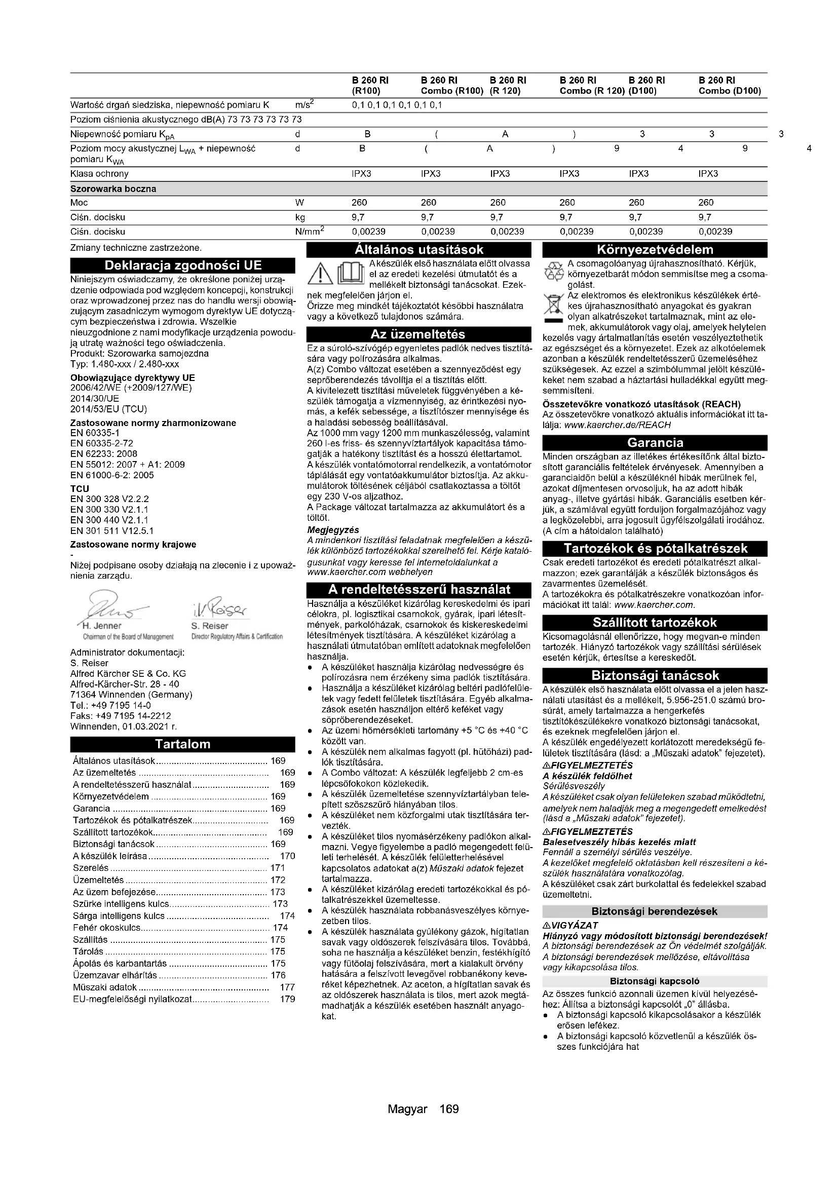 Offboard töltő gyárból Kábelhossz mm 3000 3000 3000 3000 3000 3000 Feszültség V 230 230 230 230 230 230 Frekvenciatartomány Hz 50/60 50/60 50/60 50/60 50/60 50/60 Méretei: mm 420 x 260 x 115 420 x 260 x 115 420 x 260 x 115 420 x 260 x 115 420 x 260 x 115 420 x 260 x 115 Súly kg 10 10 10 10 10 10 Érintésvédelmi osztály IP 21 IP 21 IP 21 IP 21 IP 21 IP 21 Csatlakozó típusa Schuko Schuko Schuko Schuko Schuko Schuko Töltőáram A656565656565 Környezeti feltételek Maximális környezeti hőmérséklet °C404040404040 Minimális környezeti hőmérséklet °C555555 Maximális vízhőmérséklet °C606060606060 Emelkedés Maximális emelkedés (szállításkor) % 15 10 15 10 15 10 Maximális emelkedés (súrolási üzemmódban) % 15 10 15 10 15 10 B 260 RI (R100) B 260 RI Combo (R100) B 260 RI (R 120) B 260 RI Combo (R 120) B 260 RI (D100) B 260 RI Combo (D100)Čeština 179 A műszaki változtatások jogát fenntartjuk. EU-megfelelőségi nyilatkozat Ezúton kijelentjük, hogy az alább megjelölt gép tervezé- se és felépítése alapján, valamint az általunk forgalom- ba hozott kivitelben megfelel a vonatkozó EU- irányelvek alapvető biztonsági és egészségügyi köve- telményeinek. A gépen végzett, de velünk nem egyez- tetett módosítás esetén jelen nyilatkozat érvényét veszti. Termék: Padlótisztító felülős gépek Típus: 1.480-xxx / 2.480-xxx Vonatkozó EU-irányelvek 2006/42/EK (+2009/127/EK) 2014/30/EU 2014/53/EU (TCU) Alkalmazott harmonizált szabványok EN 60335-1 EN 60335-2-72 EN 62233: 2008 EN 55012: 2007 + A1: 2009 EN 61000-6-2: 2005 TCU EN 300 328 V2.2.2 EN 300 330 V2.1.1 EN 300 440 V2.1.1 EN 301 511 V12.5.1 Alkalmazott nemzeti szabványok