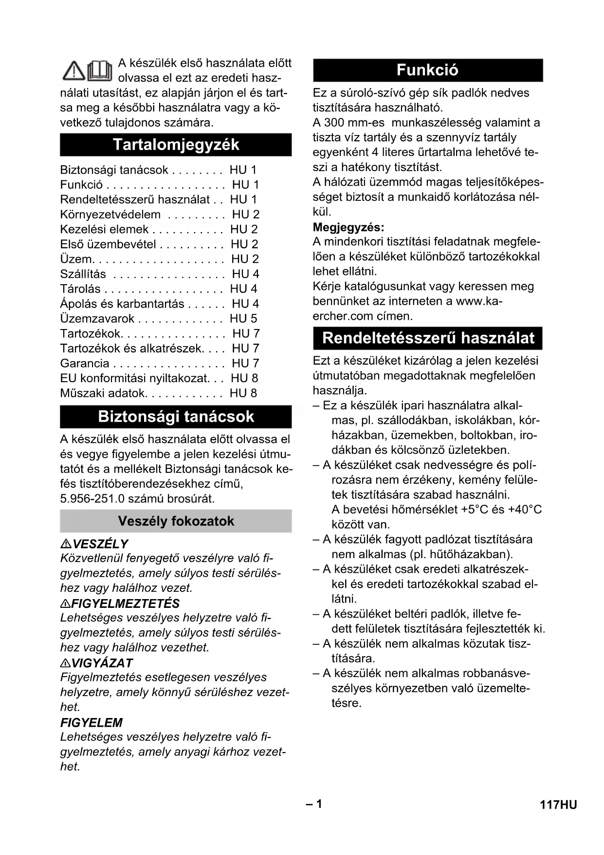 дБ(А) 1 116 RU– 1 A készülék első használata előtt olvassa el ezt az eredeti hasz- nálati utasítást, ez alapján járjon el és tart- sa meg a későbbi használatra vagy a kö- vetkező tulajdonos számára. A készülék első használata előtt olvassa el és vegye figyelembe a jelen kezelési útmu- tatót és a mellékelt Biztonsági tanácsok ke- fés tisztítóberendezésekhez című, 5.956-251.0 számú brosúrát. VESZÉLY Közvetlenül fenyegető veszélyre való fi- gyelmeztetés, amely súlyos testi sérülés- hez vagy halálhoz vezet. 몇 FIGYELMEZTETÉS Lehetséges veszélyes helyzetre való fi- gyelmeztetés, amely súlyos testi sérülés- hez vagy halálhoz vezethet. 몇 VIGYÁZAT Figyelmeztetés esetlegesen veszélyes helyzetre, amely könnyű sérüléshez vezet- het. FIGYELEM Lehetséges veszélyes helyzetre való fi- gyelmeztetés, amely anyagi kárhoz vezet- het. Ez a súroló-szívó gép sík padlók nedves tisztítására használható. A 300 mm-es munkaszélesség valamint a tiszta víz tartály és a szennyvíz tartály egyenként 4 literes űrtartalma lehetővé te- szi a hatékony tisztítást. A hálózati üzemmód magas teljesítőképes- séget biztosít a munkaidő korlátozása nél- kül. Megjegyzés: A mindenkori tisztítási feladatnak megfele- lően a készüléket különböző tartozékokkal lehet ellátni. Kérje katalógusunkat vagy keressen meg bennünket az interneten a www.ka- ercher.com címen. Ezt a készüléket kizárólag a jelen kezelési útmutatóban megadottaknak megfelelően használja. – Ez a készülék ipari használatra alkal- mas, pl. szállodákban, iskolákban, kór- házakban, üzemekben, boltokban, iro- dákban és kölcsönző üzletekben. – A készüléket csak nedvességre és polí- rozásra nem érzékeny, kemény felüle- tek tisztítására szabad használni. A bevetési hőmérséklet +5°C és +40°C között van. – A készülék fagyott padlózat tisztítására nem alkalmas (pl. hűtőházakban). – A készüléket csak eredeti alkatrészek- kel és eredeti tartozékokkal szabad el- látni. – A készüléket beltéri padlók, illetve fe- dett felületek tisztítására fejlesztették ki. – A készülék nem alkalmas közutak tisz- títására. – A készülék nem alkalmas robbanásve- szélyes környezetben való üzemelte- tésre. Tartalomjegyzék Biztonsági tanácsok . . . . . . . . HU 1 Funkció . . . . . . . . . . . . . . . . . . HU 1 Rendeltetésszerű használat . . HU 1 Környezetvédelem . . . . . . . . . HU 2 Kezelési elemek . . . . . . . . . . . HU 2 Első üzembevétel . . . . . . . . . . HU 2 Üzem. . . . . . . . . . . . . . . . . . . . HU 2 Szállítás . . . . . . . . . . . . . . . . . HU 4 Tárolás . . . . . . . . . . . . . . . . . . HU 4 Ápolás és karbantartás . . . . . . HU 4 Üzemzavarok . . . . . . . . . . . . . HU 5 Tartozékok. . . . . . . . . . . . . . . . HU 7 Tartozékok és alkatrészek. . . . HU 7 Garancia . . . . . . . . . . . . . . . . . HU 7 EU konformitási nyiltakozat. . . HU 8 Műszaki adatok. . . . . . . . . . . . HU 8 Biztonsági tanácsok Veszély fokozatok Funkció Rendeltetésszerű használat 117HU– 2 Az elektromos és az elektronikus készülé- kek gyakran tartalmaznak olyan alkotóele- meket, amelyek helytelen kezelés vagy helytelen ártalmatlanítás esetén potenciális veszélyt jelenthetnek az emberi egészség- re és a környezetre. A készülék szabály- szerű üzemeltetéséhez azonban szükség van ezekre az alkotóelemekre. Az ilyen szimbólummal megjelölt készülékeket nem szabad a háztartási hulladékkal együtt ár- talmatlanítani. Megjegyzések a tartalmazott anyagok- kal kapcsolatban (REACH) Aktuális információkat a tartalmazott anya- gokkal kapcsolatosan a következő címen talál: www.kaercher.com/REACH