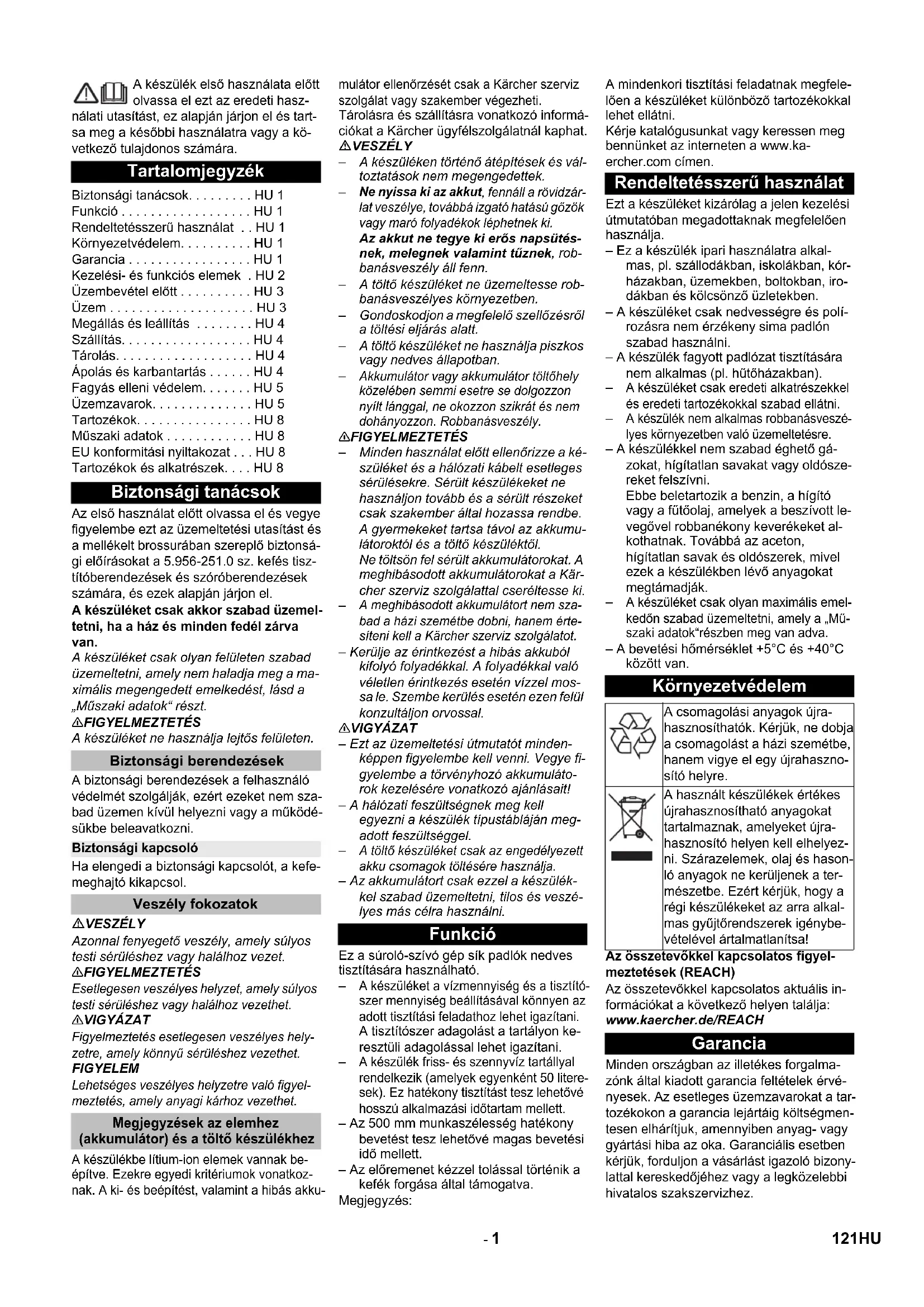 A meghibásodott akkumulátort nem sza- bad a házi szemétbe dobni, hanem érte- síteni kell a Kärcher szerviz szolgálatot. – Kerülje az érintkezést a hibás akkuból kifolyó folyadékkal. A folyadékkal való véletlen érintkezés esetén vízzel mos- sa le. Szembe kerülés esetén ezen felül konzultáljon orvossal. 몇 VIGYÁZAT – Ezt az üzemeltetési útmutatót minden- képpen figyelembe kell venni. Vegye fi- gyelembe a törvényhozó akkumuláto- rok kezelésére vonatkozó ajánlásait! – A hálózati feszültségnek meg kell egyezni a készülék típustábláján meg- adott feszültséggel.