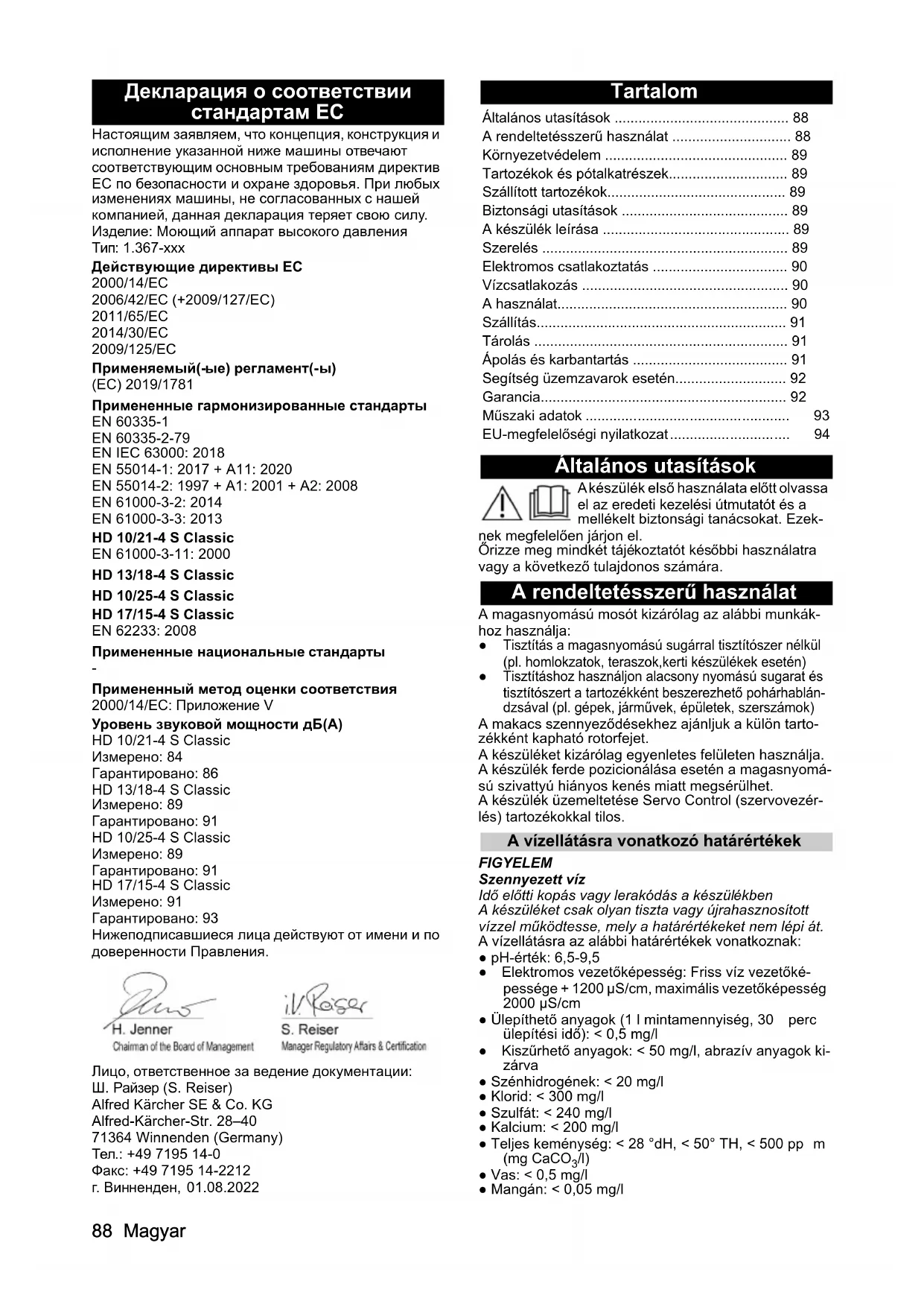 dB(A)8691919394 Čeština EU-megfelelőségi nyilatkozat Ezúton kijelentjük, hogy az alább megjelölt gép tervezése és felépítése alapján, valamint az általunk forgalomba ho- zott kivitelben megfelel a vonatkozó EU-irányelvek alapve- tő biztonsági és egészségügyi követelményeinek. A gépen végzett, de velünk nem egyeztetett módosítás esetén jelen nyilatkozat érvényét veszti. Termék: Magasnyomású mosó Típus: 1.367-xxx Vonatkozó EU-irányelvek 2000/14/EK 2006/42/EK (+2009/127/EK) 2011/65/EU irányelv 2014/30/EU irányelv 2009/125/EK Alkalmazott rendelet(ek) (EU) 2019/1781 Alkalmazott harmonizált szabványok EN 60335-1 EN 60335-2-79 EN IEC 63000: 2018 EN 55014-1: 2017 + A11: 2020 EN 55014-2: 1997 + A1: 2001 + A2: 2008 EN 61000-3-2: 2014 EN 61000-3-3: 2013 HD 10/21-4 S Classic EN 61000-3-11: 2000 HD 13/18-4 S Classic HD 10/25-4 S Classic HD 17/15-4 S Classic EN 62233: 2008 Alkalmazott nemzeti szabványok