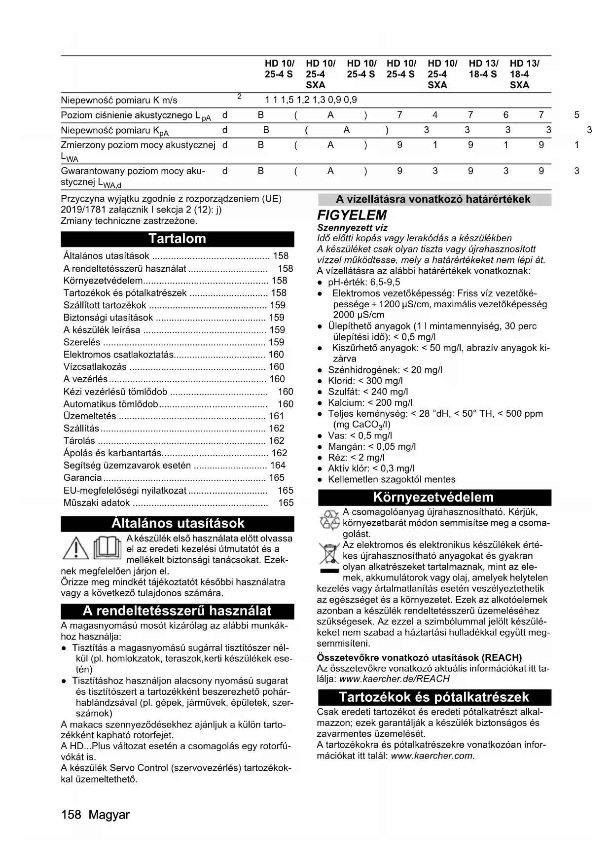 4,7 4,7 6,1 6,6 5,3 3,7 3,7158 Magyar Przyczyna wyjątku zgodnie z rozporządzeniem (UE) 2019/1781 załącznik I sekcja 2 (12): j) Zmiany techniczne zastrzeżone. Tartalom Általános utasítások A készülék első használata előtt olvassa el az eredeti kezelési útmutatót és a mellékelt biztonsági tanácsokat. Ezek- nek megfelelően járjon el. Őrizze meg mindkét tájékoztatót későbbi használatra vagy a következő tulajdonos számára. A rendeltetésszerű használat A magasnyomású mosót kizárólag az alábbi munkák- hoz használja: ● Tisztítás a magasnyomású sugárral tisztítószer nél- kül (pl. homlokzatok, teraszok,kerti készülékek ese- tén) ● Tisztításhoz használjon alacsony nyomású sugarat és tisztítószert a tartozékként beszerezhető pohár- hablándzsával (pl. gépek, járművek, épületek, szer- számok) A makacs szennyeződésekhez ajánljuk a külön tarto- zékként kapható rotorfejet. A HD...Plus változat esetén a csomagolás egy rotorfú- vókát is. A készülék Servo Control (szervovezérlés) tartozékok- kal üzemeltethető. A vízellátásra vonatkozó határértékek FIGYELEM Szennyezett víz Idő előtti kopás vagy lerakódás a készülékben A készüléket csak olyan tiszta vagy újrahasznosított vízzel működtesse, mely a határértékeket nem lépi át. A vízellátásra az alábbi határértékek vonatkoznak: ● pH-érték: 6,5-9,5 ● Elektromos vezetőképesség: Friss víz vezetőké- pessége + 1200 µS/cm, maximális vezetőképesség 2000 µS/cm ● Ülepíthető anyagok (1 l mintamennyiség, 30 perc ülepítési idő): < 0,5 mg/l ● Kiszűrhető anyagok: < 50 mg/l, abrazív anyagok ki- zárva ● Szénhidrogének: < 20 mg/l ● Klorid: < 300 mg/l ● Szulfát: < 240 mg/l ● Kalcium: < 200 mg/l ● Teljes keménység: < 28 °dH, < 50° TH, < 500 ppm (mg CaCO