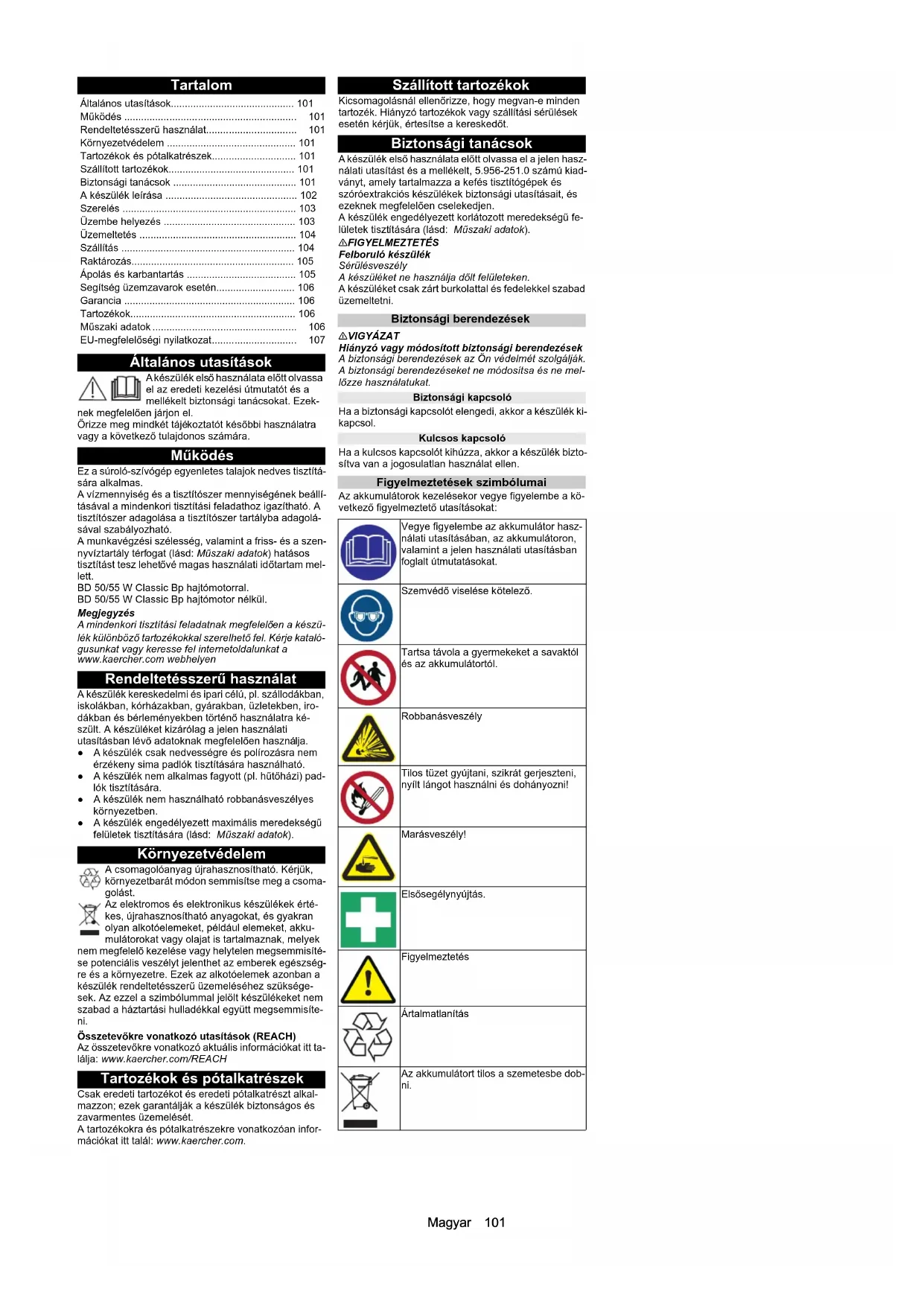 - dB(A) 84,1 84,1 Chairman of the Board of Management Director Regulatory Affairs & Certification H. Jenner S. ReiserMagyar 101 Tartalom Általános utasítások A készülék első használata előtt olvassa el az eredeti kezelési útmutatót és a mellékelt biztonsági tanácsokat. Ezek- nek megfelelően járjon el. Őrizze meg mindkét tájékoztatót későbbi használatra vagy a következő tulajdonos számára. Működés Ez a súroló-szívógép egyenletes talajok nedves tisztítá- sára alkalmas. A vízmennyiség és a tisztítószer mennyiségének beállí- tásával a mindenkori tisztítási feladathoz igazítható. A tisztítószer adagolása a tisztítószer tartályba adagolá- sával szabályozható. A munkavégzési szélesség, valamint a friss- és a szen- nyvíztartály térfogat (lásd: Műszaki adatok) hatásos tisztítást tesz lehetővé magas használati időtartam mel- lett. BD 50/55 W Classic Bp hajtómotorral. BD 50/55 W Classic Bp hajtómotor nélkül. Megjegyzés A mindenkori tisztítási feladatnak megfelelően a készü- lék különböző tartozékokkal szerelhető fel. Kérje kataló- gusunkat vagy keresse fel internetoldalunkat a www.kaercher.com webhelyen Rendeltetésszerű használat A készülék kereskedelmi és ipari célú, pl. szállodákban, iskolákban, kórházakban, gyárakban, üzletekben, iro- dákban és bérleményekben történő használatra ké- szült. A készüléket kizárólag a jelen használati utasításban lévő adatoknak megfelelően használja. ● A készülék csak nedvességre és polírozásra nem érzékeny sima padlók tisztítására használható. ● A készülék nem alkalmas fagyott (pl. hűtőházi) pad- lók tisztítására. ● A készülék nem használható robb anásveszélyes kör nyezetben. ● A készülék engedélyezett maximális meredekségű felületek tisztítására (lásd: Műszaki adatok). Környezetvédelem A csomagolóanyag újrahasznosítható. Kérjük, környezetbarát módon semmisítse meg a csoma- golást. Az elektromos és elektronikus készülékek érté- kes, újrahasznosítható anyagokat, és gyakran olyan alkotóelemeket, például elemeket, akku- mulátorokat vagy olajat is tartalmaznak, melyek nem megfelelő kezelése vagy helytelen megsemmisíté- se potenciális veszélyt jelenthet az emberek egészség- re és a környezetre. Ezek az alkotóelemek azonban a készülék rendeltetésszerű üzemeléséhez szüksége- sek. Az ezzel a szimbólummal jelölt készülékeket nem szabad a háztartási hulladékkal együtt megsemmisíte- ni. Összetevőkre vonatkozó utasítások (REACH) Az összetevőkre vonatkozó aktuális információkat itt ta- lálja: www.kaercher.com/REACH Tartozékok és pótalkatrészek Csak eredeti tartozékot és eredeti pótalkatrészt alkal- mazzon; ezek garantálják a készülék biztonságos és zavarmentes üzemelését. A tartozékokra és pótalkatrészekre vonatkozóan infor- mációkat itt talál: www.kaercher.com. Szállított tartozékok Kicsomagolásnál ellenőrizze, hogy megvan-e minden tartozék. Hiányzó tartozékok vagy szállítási sérülések esetén kérjük, értesítse a kereskedőt. Biztonsági tanácsok A készülék első használata előtt olvassa el a jelen hasz- nálati utasítást és a mellékelt, 5.956-251.0 számú kiad- ványt, amely tartalmazza a kefés tisztítógépek és szóróextrakciós készülékek biztonsági utasításait, és ezeknek megfelelően cselekedjen. A készülék engedélyezett korlátozott meredekségű fe- lületek tisztítására (lásd: Műszaki adatok). 몇 FIGYELMEZTETÉS Felboruló készülék Sérülésveszély A készüléket ne használja dőlt felületeken. A készüléket csak zárt burkolattal és fedelekkel szabad üzemeltetni. Biztonsági berendezések 몇 VIGYÁZAT Hiányzó vagy módosított biztonsági berendezések A biztonsági berendezések az Ön védelmét szolgálják. A biztonsági berendezéseket ne módosítsa és ne mel- lőzze használatukat. Biztonsági kapcsoló Ha a biztonsági kapcsolót elengedi, akkor a készülék ki- kapcsol. Kulcsos kapcsoló Ha a kulcsos kapcsolót kihúzza, akkor a készülék bizto- sítva van a jogosulatlan használat ellen. Figyelmeztetések szimbólumai Az akkumulátorok kezelésekor vegye figyelembe a kö- vetkező figyelmeztető utasításokat: Általános utasítások p. 101