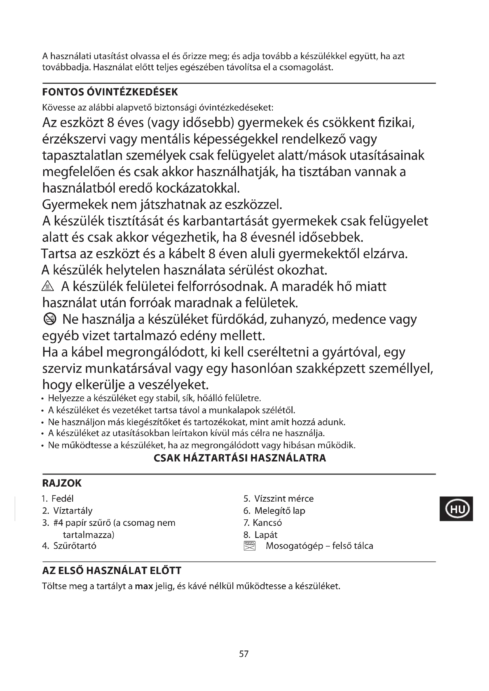 Kövesse az alábbi alapvető biztonsági óvintézkedéseket: Az eszközt 8 éves (vagy idősebb) gyermekek és csökkent zikai, érzékszervi vagy mentális képességekkel rendelkező vagy tapasztalatlan személyek csak felügyelet alatt/mások utasításainak megfelelően és csak akkor használhatják, ha tisztában vannak a használatból eredő kockázatokkal. Gyermekek nem játszhatnak az eszközzel. A készülék tisztítását és karbantartását gyermekek csak felügyelet alatt és csak akkor végezhetik, ha 8 évesnél idősebbek. Tartsa az eszközt és a kábelt 8 éven aluli gyermekektől elzárva. A készülék helytelen használata sérülést okozhat. h A készülék felületei felforrósodnak. A maradék hő miatt használat után forróak maradnak a felületek. b Ne használja a készüléket fürdőkád, zuhanyzó, medence vagy egyéb vizet tartalmazó edény mellett. Ha a kábel megrongálódott, ki kell cseréltetni a gyártóval, egy szerviz munkatársával vagy egy hasonlóan szakképzett személlyel, hogy elkerülje a veszélyeket.