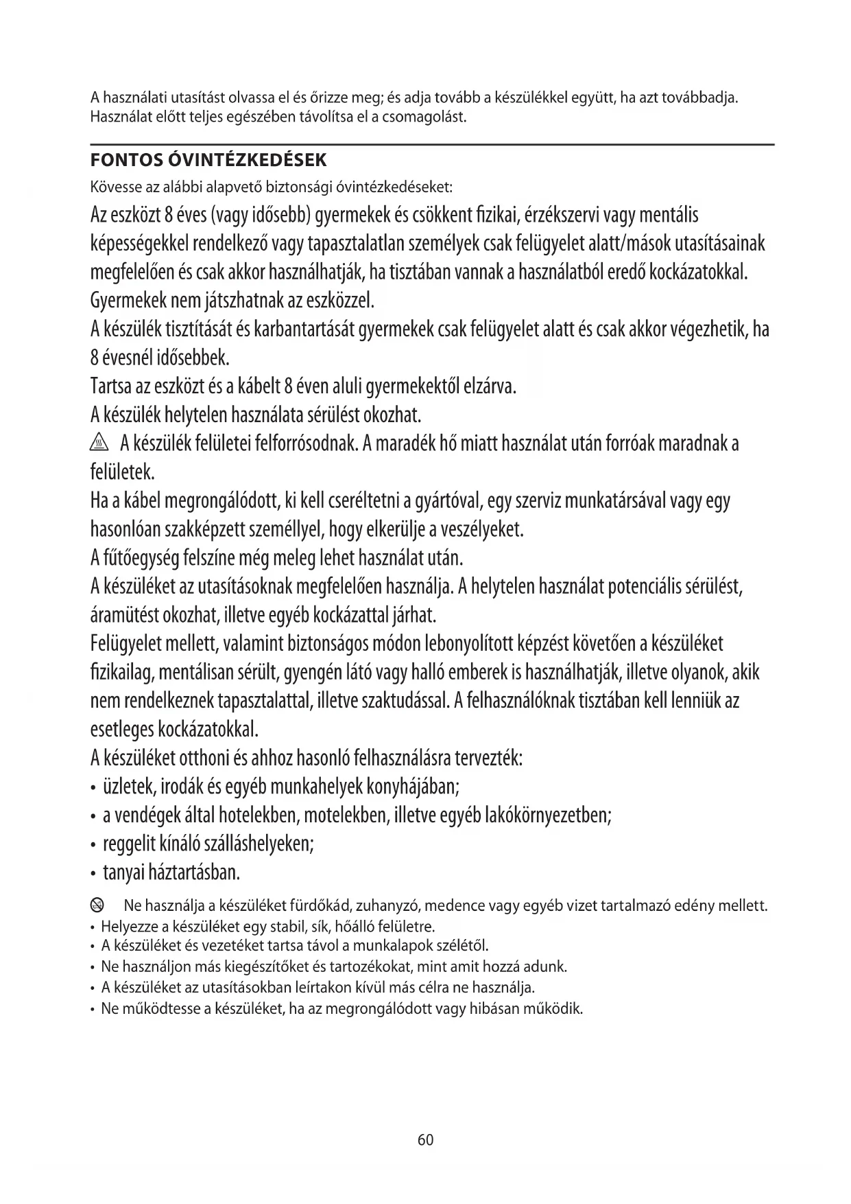 Kövesse az alábbi alapvető biztonsági óvintézkedéseket: Az eszközt 8 éves (vagy idősebb) gyermekek és csökkent zikai, érzékszervi vagy mentális képességekkel rendelkező vagy tapasztalatlan személyek csak felügyelet alatt/mások utasításainak megfelelően és csak akkor használhatják, ha tisztában vannak a használatból eredő kockázatokkal. Gyermekek nem játszhatnak az eszközzel. A készülék tisztítását és karbantartását gyermekek csak felügyelet alatt és csak akkor végezhetik, ha 8 évesnél idősebbek. Tartsa az eszközt és a kábelt 8 éven aluli gyermekektől elzárva. A készülék helytelen használata sérülést okozhat. h A készülék felületei felforrósodnak. A maradék hő miatt használat után forróak maradnak a felületek. Ha a kábel megrongálódott, ki kell cseréltetni a gyártóval, egy szerviz munkatársával vagy egy hasonlóan szakképzett személlyel, hogy elkerülje a veszélyeket. A fűtőegység felszíne még meleg lehet használat után. A készüléket az utasításoknak megfelelően használja. A helytelen használat potenciális sérülést, áramütést okozhat, illetve egyéb kockázattal járhat. Felügyelet mellett, valamint biztonságos módon lebonyolított képzést követően a készüléket zikailag, mentálisan sérült, gyengén látó vagy halló emberek is használhatják, illetve olyanok, akik nem rendelkeznek tapasztalattal, illetve szaktudással. A felhasználóknak tisztában kell lenniük az esetleges kockázatokkal. A készüléket otthoni és ahhoz hasonló felhasználásra tervezték: