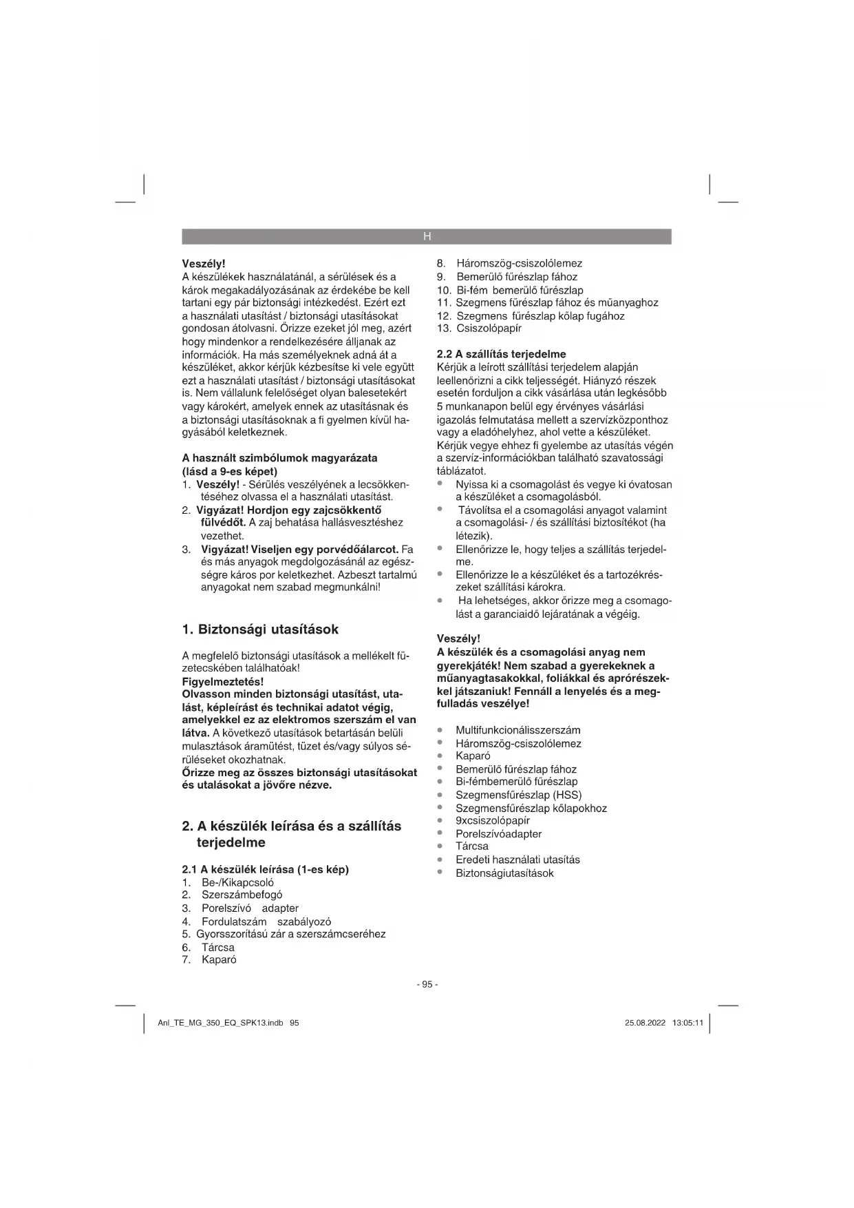 rezgésekből adódnak, ha a készülék hossz- abb ideig használva lesz, vagy ha nem lesz szabályszerűen vezetve és karbantartva. Anl_TE_MG_350_EQ_SPK13.indb 96Anl_TE_MG_350_EQ_SPK13.indb 96 25.08.2022 13:05:1225.08.2022 13:05:12H