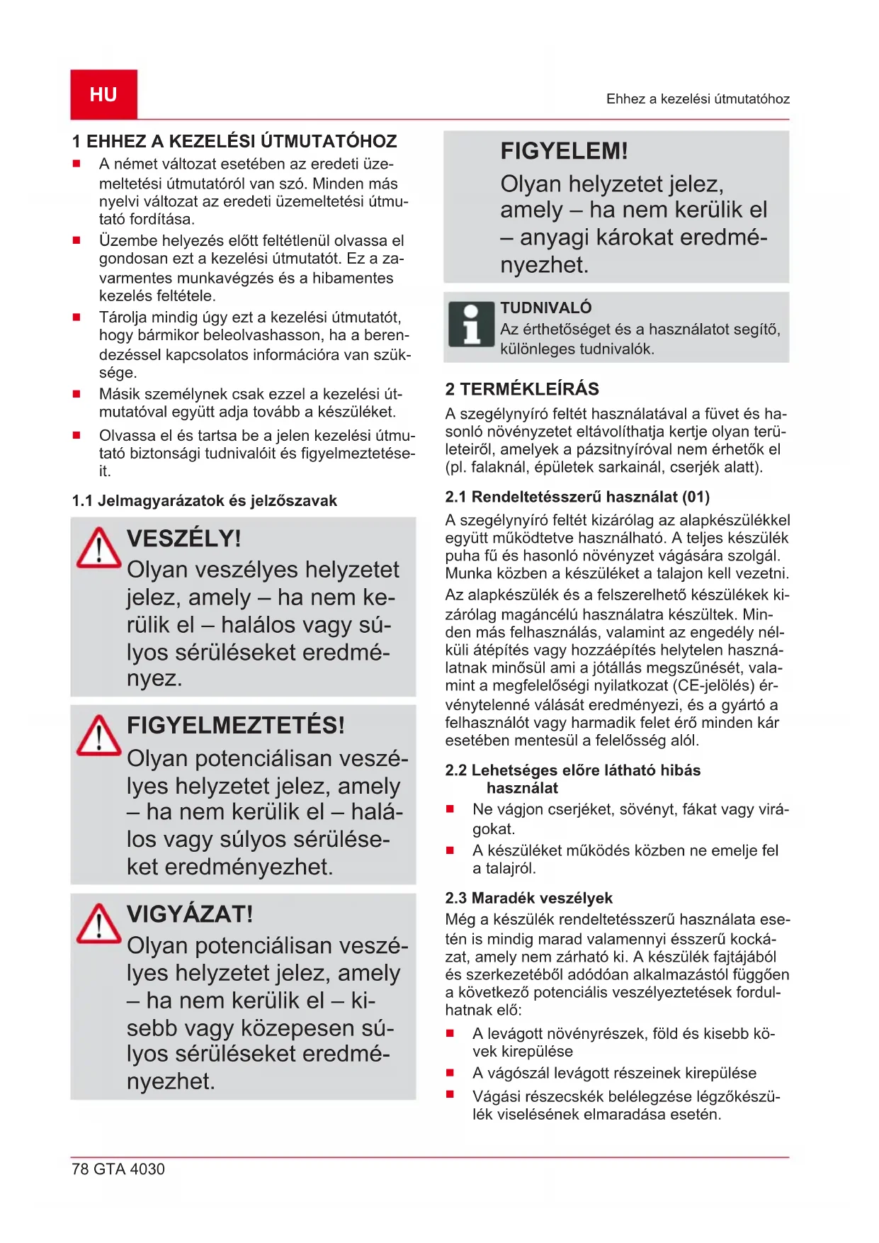 a motort kapcsolja ki,HU 82 GTA 4030 Biztonsági utasítások