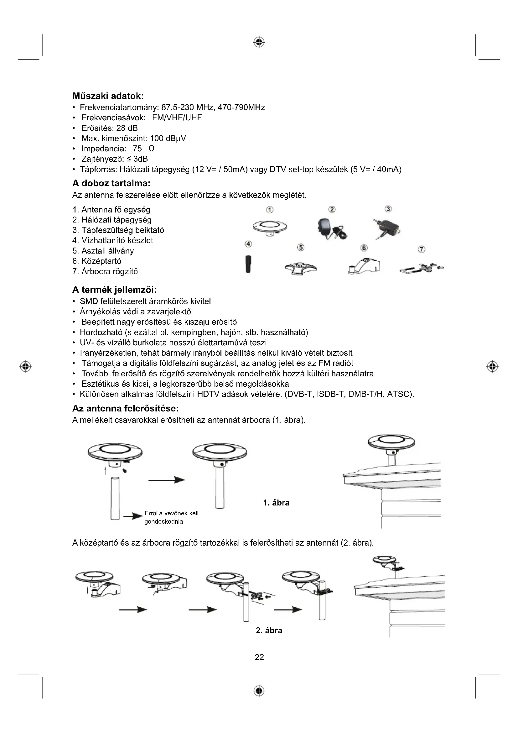 - Különösen alkalmas földfelszíni HDTV adások vételére. (DVB-T; ISDB-T; DMB-T/H; ATSC). Az antenna felerősítése: A mellékelt csavarokkal erősítheti az antennát árbocra (1. ábra). A középtartó és az árbocra rögzítő tartozékkal is felerősítheti az antennát (2. ábra). Erről a vevőnek kell gondoskodnia