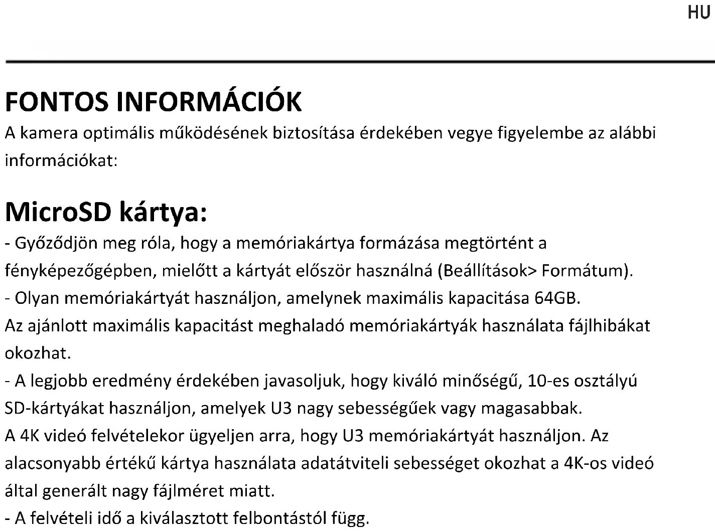 A kamera optimális működésének biztosítása érdekében vegye figyelembe az alábbi információkat: MicroSD kártya: - Győződjön meg róla, hogy a memóriakártya formázása megtörtént a fényképezőgépben, mielőtt a kártyát először használná (Beállítások> Formátum). - Olyan memóriakártyát használjon, amelynek maximális kapacitása 64GB. Az ajánlott maximális kapacitást meghaladó memóriakártyák használata fájlhibákat okozhat. - A legjobb eredmény érdekében javasoljuk, hogy kiváló minőségű, 10-es osztályú SD-kártyákat használjon, amelyek U3 nagy sebességűek vagy magasabbak. A 4K videó felvételekor ügyeljen arra, hogy U3 memóriakártyát használjon. Az alacsonyabb értékű kártya használata adatátviteli sebességet okozhat a 4K-os videó által generált nagy fájlméret miatt. - A felvételi idő a kiválasztott felbontástól függ.HU