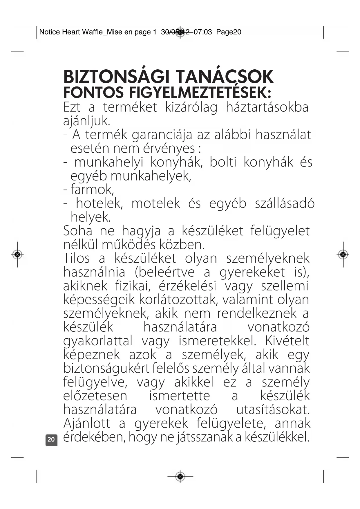 FONTOS FIGYELMEZTETÉSEK: Ezt a terméket kizárólag háztartásokba ajánljuk. - A termék garanciája az alábbi használat esetén nem érvényes : - munkahelyi konyhák, bolti konyhák és egyéb munkahelyek, - farmok, - hotelek, motelek és egyéb szállásadó helyek. Soha ne hagyja a készüléket felügyelet nélkül működés közben. Tilos a készüléket olyan személyeknek használnia (beleértve a gyerekeket is), akiknek fizikai, érzékelési vagy szellemi képességeik korlátozottak, valamint olyan személyeknek, akik nem rendelkeznek a készülék használatára vonatkozó gyakorlattal vagy ismeretekkel. Kivételt képeznek azok a személyek, akik egy biztonságukért felelős személy által vannak felügyelve, vagy akikkel ez a személy előzetesen ismertette a készülék használatára vonatkozó utasításokat. Ajánlott a gyerekek felügyelete, annak érdekében, hogy ne játsszanak a készülékkel. Notice Heart Waffle_Mise en page 1 30/05/12 07:03 Page2021