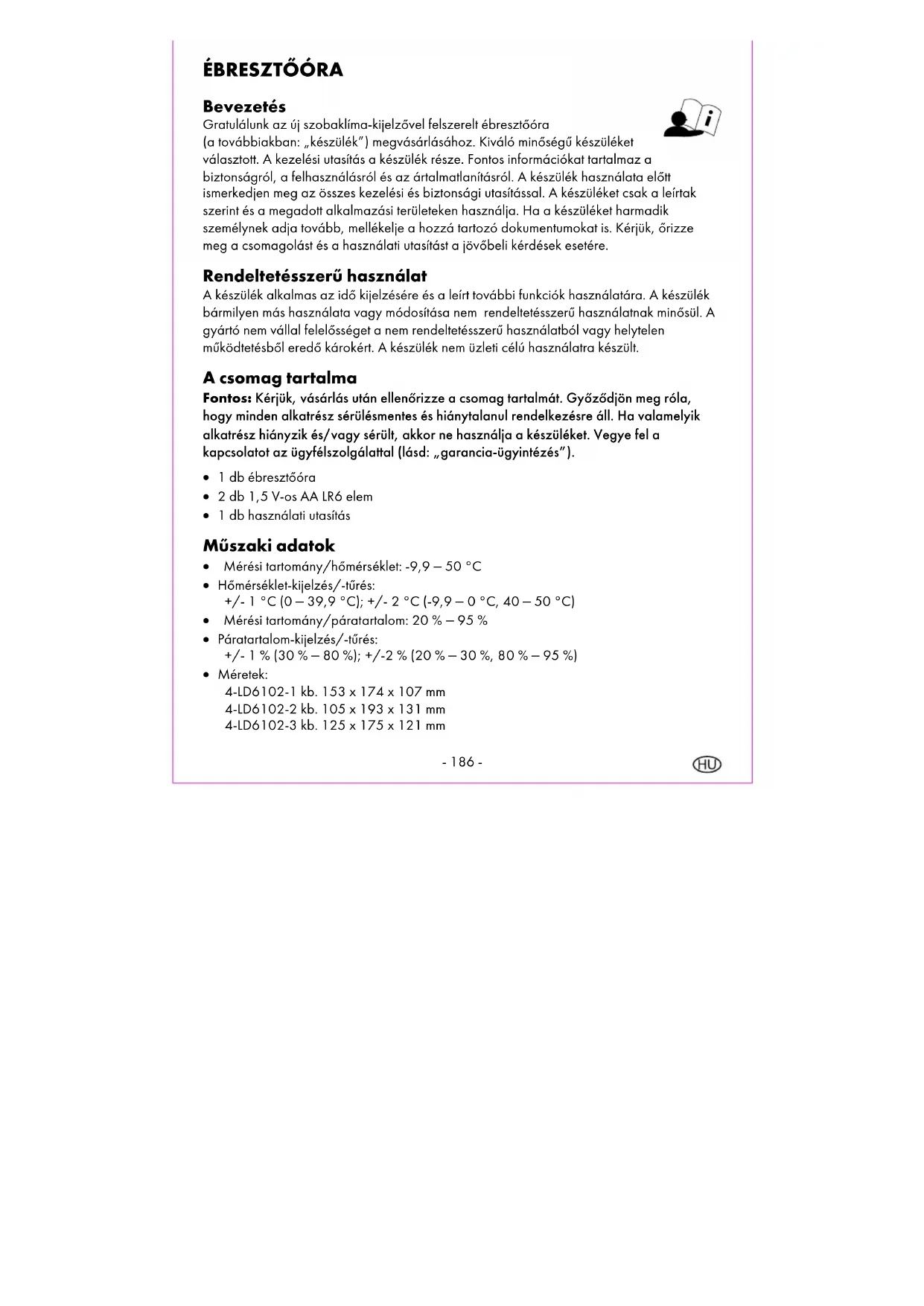 Si prega di notare che il seguente indirizzo non è un indirizzo di assistenza. Contattare prima il punto di assistenza sopra indicato. digi-tech gmbh Valterweg 27A 65817 Eppstein GERMANIA- 184 - Használati és biztonsági tanácsok Tartalomjegyzék Tartalomjegyzék ................................................................................... - 184 - Bevezetés .............................................................................................. - 186 - Rendeltetésszerű használat ................................................................. - 186 - A csomag tartalma ............................................................................... - 186 - Műszaki adatok .................................................................................... - 186 - Szimbólumok magyarázata ................................................................ - 187 - Az elem szimbólumok magyarázata .................................................. - 188 - Fontos biztonsági előírások Fontos biztonsági előírásokFontos biztonsági előírások Fontos biztonsági előírások .............................................................. - 189 - Biztonsági előírások a felhasználók számára ............................. - 189 - Epilepszia figyelmeztetés .............................................................. - 189 - Az elemekre vonatkozó biztonsági előírások .............................. - 190 - Biztonságosan állítsa fel a készüléket .......................................... - 191 - Kijelző .................................................................................................... - 192 - Kezelőfelület ......................................................................................... - 193 - Üzembe helyezés ................................................................................. - 193 - Beállítás ................................................................................................. - 194 - Alap és időbeállítás ....................................................................... - 194 - Riasztás ................................................................................................. - 194 - Ébresztés beállítása ....................................................................... - 194 - Az ébresztés be- és kikapcsolása ................................................. - 194 - Szundi funkció (SNOOZE) ............................................................ - 194 - Világítás/éjszakai fény ........................................................................ - 195 - A világítás/éjszakai fény beállítása ............................................. - 195 - A világítás/éjszakai lámpa be- és kikapcsolása ........................ - 195 - Hőmérséklet .......................................................................................... - 195 - 12/24 órás kijelző .............................................................................. - 195 - Tisztítási tanácsok ................................................................................. - 196 - Tárolás ................................................................................................... - 196 - Egyszerűsített EU-megfelelőségi nyilatkozat ...................................... - 196 - Ártalmatlanítás ...................................................................................... - 196 - Az elektromos készülék ártalmatlanítása ..................................... - 196 - Az elemek ártalmatlanítása ........................................................... - 197 - Újrahasznosítás .............................................................................. - 199 - Hulladékkezelés ............................................................................. - 199 -- 185 - JÓTÁLLÁSI TÁJÉKOZTATÓ ................................................................. - 199 - A digi-tech gmbh által nyújtott garancia ............................................ - 201 - Jótállási feltételek ........................................................................... - 201 - Garanciális időszak és törvényi hibajavítási igények ................. - 201 - A garancia hatálya ........................................................................ - 202 - A garancia érvényesítése .............................................................. - 202 - Szerviz ................................................................................................... - 203 - Szállító ................................................................................................... - 204 -- 186 - ÉBRESZTŐÓRA Bevezetés Gratulálunk az új szobaklíma-kijelzővel felszerelt ébresztőóra (a továbbiakban: „készülék”) megvásárlásához. Kiváló minőségű készüléket választott. A kezelési utasítás a készülék része. Fontos információkat tartalmaz a biztonságról, a felhasználásról és az ártalmatlanításról. A készülék használata előtt ismerkedjen meg az összes kezelési és biztonsági utasítással. A készüléket csak a leírtak szerint és a megadott alkalmazási területeken használja. Ha a készüléket harmadik személynek adja tovább, mellékelje a hozzá tartozó dokumentumokat is. Kérjük, őrizze meg a csomagolást és a használati utasítást a jövőbeli kérdések esetére. Rendeltetésszerű használat A készülék alkalmas az idő kijelzésére és a leírt további funkciók használatára. A készülék bármilyen más használata vagy módosítása nem rendeltetésszerű használatnak minősül. A gyártó nem vállal felelősséget a nem rendeltetésszerű használatból vagy helytelen működtetésből eredő károkért. A készülék nem üzleti célú használatra készült. A csomag tartalma Fontos: Kérjük, vásárlás után ellenőrizze a csomag tartalmát. Győződjö