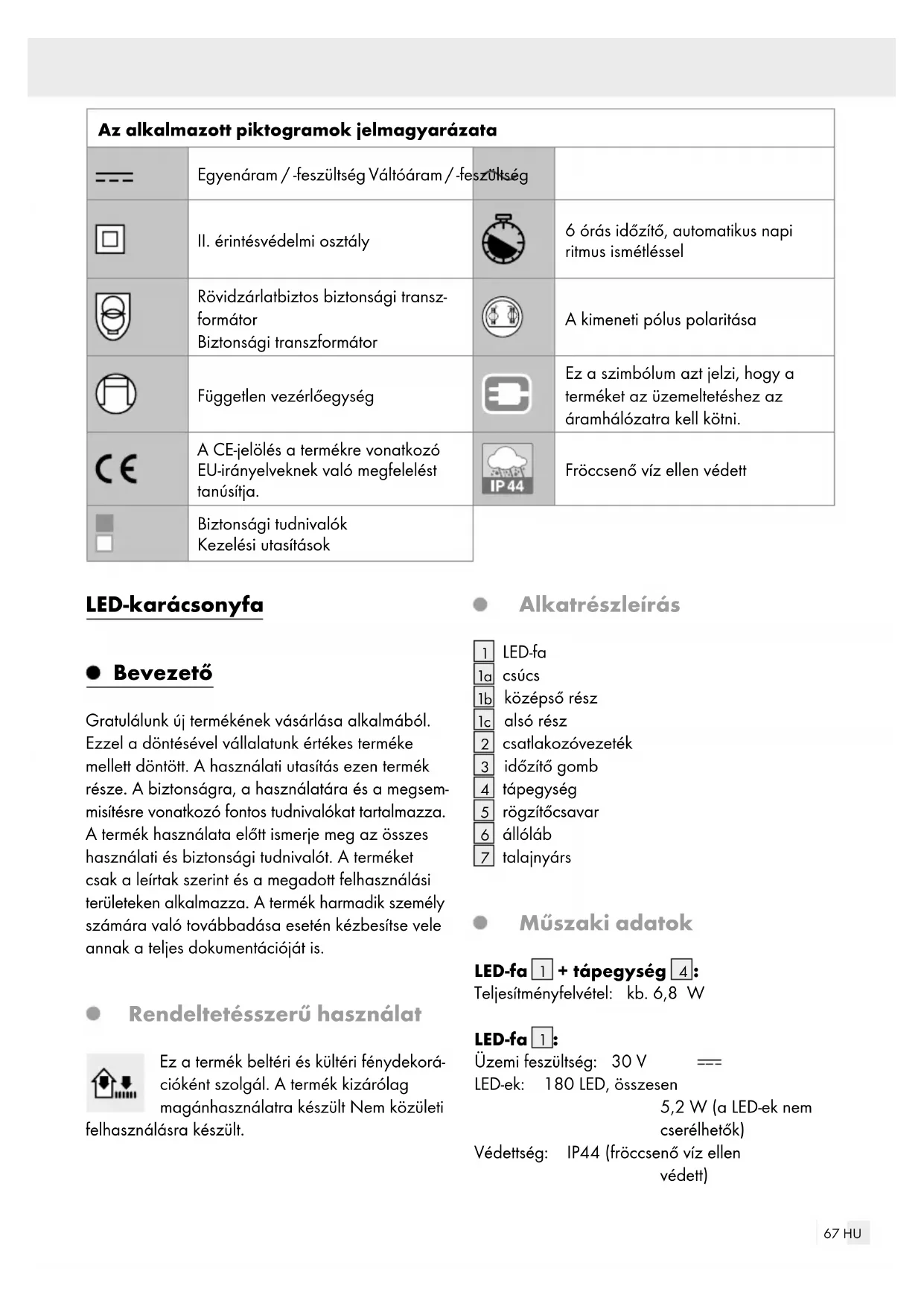 6 órás időzítő, automatikus napi ritmus ismétléssel Rövidzárlatbiztos biztonsági transz- formátor Biztonsági transzformátor A kimeneti pólus polaritása Független vezérlőegység Ez a szimbólum azt jelzi, hogy a terméket az üzemeltetéshez az áramhálózatra kell kötni. A CE-jelölés a termékre vonatkozó EU-irányelveknek való megfelelést tanúsítja. Fröccsenő víz ellen védett Biztonsági tudnivalók Kezelési utasítások LED-karácsonyfa Bevezető Gratulálunk új termékének vásárlása alkalmából. Ezzel a döntésével vállalatunk értékes terméke mellett döntött. A használati utasítás ezen termék része. A biztonságra, a használatára és a megsem- misítésre vonatkozó fontos tudnivalókat tartalmazza. A termék használata előtt ismerje meg az összes használati és biztonsági tudnivalót. A terméket csak a leírtak szerint és a megadott felhasználási területeken alkalmazza. A termék harmadik személy számára való továbbadása esetén kézbesítse vele annak a teljes dokumentációját is. Rendeltetésszerű használat Ez a termék beltéri és kültéri fénydekorá- cióként szolgál. A termék kizárólag magánhasználatra készült Nem közületi felhasználásra készült. Alkatrészleírás