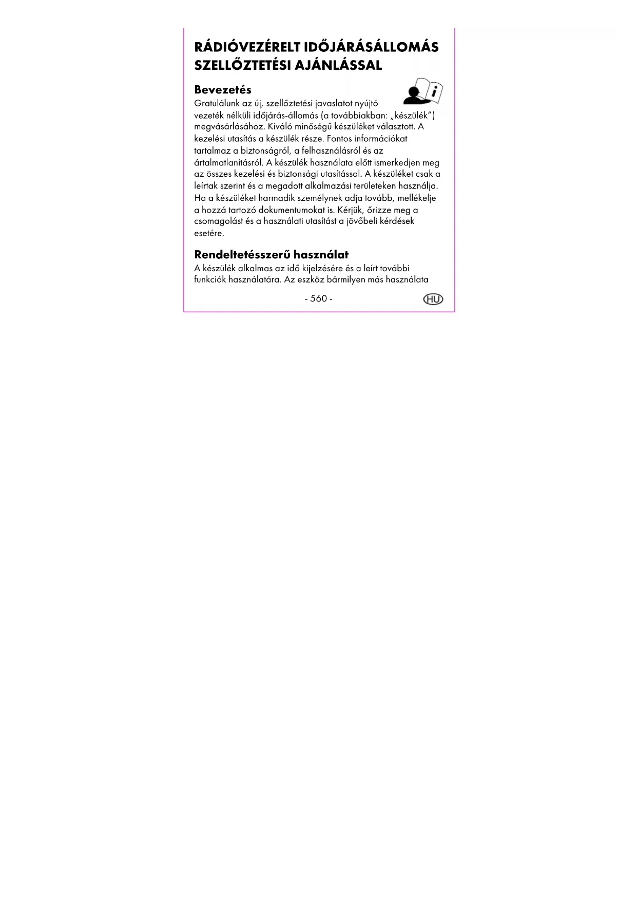 Fornitore Prendere nota che l’indirizzo seguente non è un indirizzo destinato all’assistenza. Prendere contatto dapprima con il punto di Assistenza precedentemente indicato. digi-tech gmbh Valterweg 27A 65817 Eppstein GERMANIA- 557 - Használati és biztonsági tanácsok Tartalomjegyzék Tartalomjegyzék ...................................................................- 557 - Bevezetés ..............................................................................- 560 - Rendeltetésszerű használat ..................................................- 560 - A csomag tartalma ...............................................................- 561 - Műszaki adatok ....................................................................- 562 - Készülék ..........................................................................- 562 - Vezeték nélküli kültéri érzékelő .....................................- 562 - Jelmagyarázat ......................................................................- 563 - Fontos biztonsági előírások Fontos biztonsági előírásokFontos biztonsági előírások Fontos biztonsági előírások ..............................................- 567 - Biztonsági előírások a felhasználók számára ..............- 567 - Az elemekre vonatkozó biztonsági előírások ..............- 568 - Függessze fel vagy állítsa fel biztonságosan a készüléket .......- 572 - Függessze fel vagy helyezze el biztonságosan a külső érzékelőt. ...............................................................................- 573 - Kijelző és kezelőfelületek .....................................................- 575 - Készülék ..........................................................................- 575 - Vezeték nélküli kültéri érzékelő .....................................- 579 -- 558 - Üzembe helyezés .................................................................- 580 - Gyorsbeállítás .......................................................................- 582 - Alapbeállítások .....................................................................- 582 - Időzóna beállítása ................................................................- 583 - Rádiójel vétele.......................................................................- 584 - Rádiójel vételi zavara ....................................................- 584 - A rádiójel vételének ki- és bekapcsolása .....................- 585 - A rádiójel vételének újraindítása...................................- 586 - Világítás .................................................................................- 586 - 12/24 órás időformátum ....................................................- 587 - Hőmérséklet ..........................................................................- 587 - Ébresztő funkció ....................................................................- 587 - Ébresztő beállítása .........................................................- 587 - Az ébresztés be- és kikapcsolása .................................- 588 - Szundi funkció (SNOOZE) ............................................- 589 - Vezeték nélküli kültéri érzékelő/csatorna beállítása.........- 589 - Szellőzés értékelése .............................................................- 592 - Beltéri klíma értékelése .........................................................- 592 - Szellőztetési javaslat ............................................................- 593 - Penészveszélyre vonatkozó figyelmeztetés ........................- 594 - Penészveszélyre vonatkozó figyelmeztetés beállítása - 594 -- 559 - A penészveszélyre vonatkozó figyelmeztetés be- és kikapcsolása ...................................................................- 595 - Maximális és minimális értékek ...........................................- 596 - Elemállapot-jelző ..................................................................- 597 - Újraindítás (RESET) ...............................................................- 597 - Tisztítási tanácsok .................................................................- 597 - Tárolás ...................................................................................- 598 - Egyszerűsített EU-megfelelőségi nyilatkozat ......................- 598 - Ártalmatlanítás ......................................................................- 599 - Az elektromos készülék ártalmatlanítása .....................- 599 - Az elemek ártalmatlanítása ...........................................- 603 - Újrahasznosítás ..............................................................- 606 - Hulladékkezelés .............................................................- 607 - HU JÓTÁLLÁSI TÁJÉKOZTATÓ ...........................................- 607 - A garancia kirterjedése ..................................................- 611 - Garanciaigény bejelentése ...........................................- 612 - Megrendelés .........................................................................- 614 - Ügyfélszolgálat/szerviz ......................................................- 614 - Szállító ...................................................................................- 616 -- 560 - RÁDIÓVEZÉRELT IDŐJÁRÁSÁLLOMÁS
