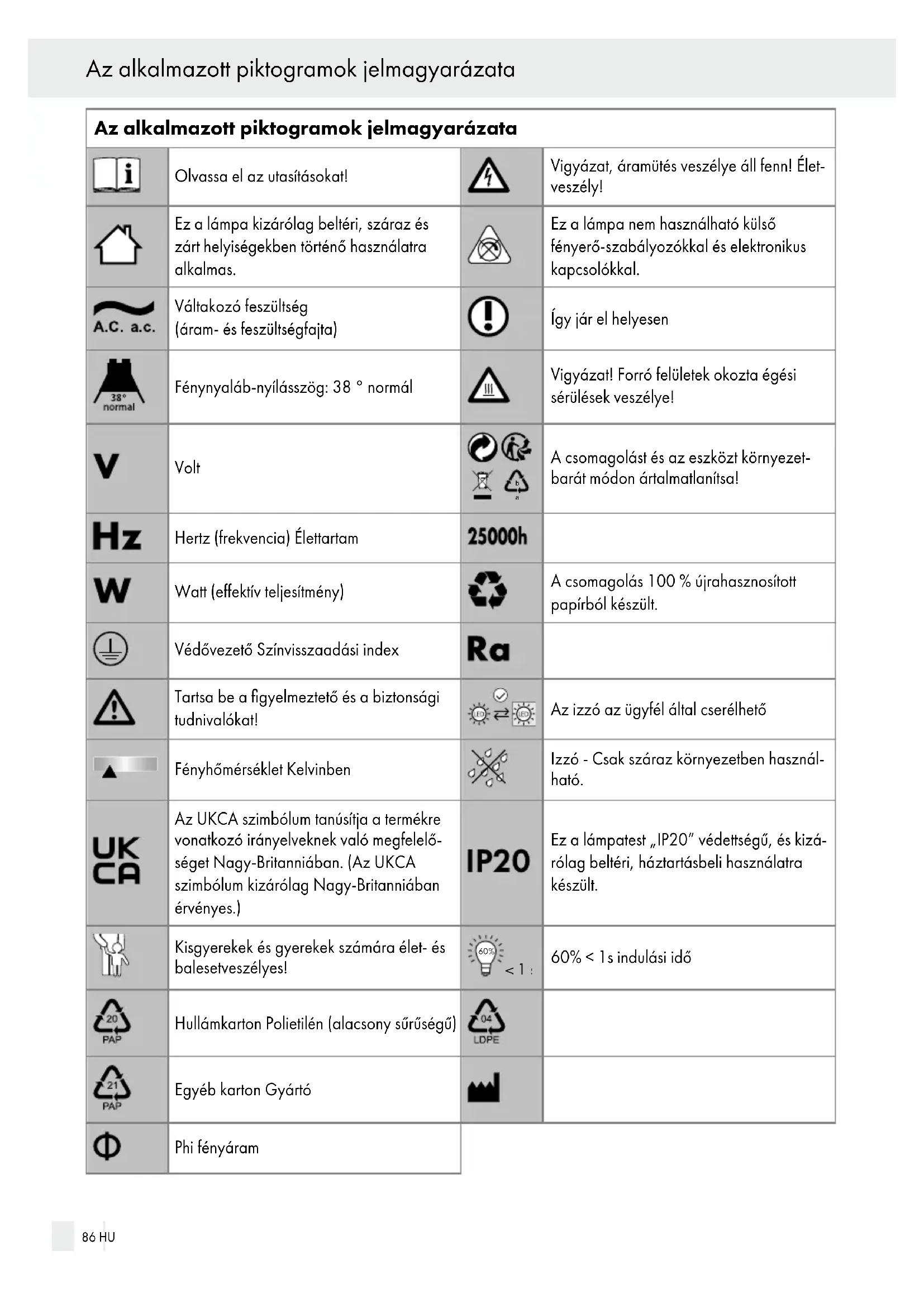 Tartalom HU 85Az alkalmazott piktogramok jelmagyarázata Olvassa el az utasításokat! Vigyázat, áramütés veszélye áll fenn! Élet veszély! Ez a lámpa kizárólag beltéri, száraz és zárt helyiségekben történő használatra alkalmas. Ez a lámpa nem használható külső fényerő-szabályozókkal és elektronikus kapcsolókkal. Váltakozó feszültség (áram- és feszültségfajta) Így jár el helyesen Fénynyaláb-nyílásszög: 38 ° normál Vigyázat! Forró felületek okozta égési sérülések veszélye! Volt