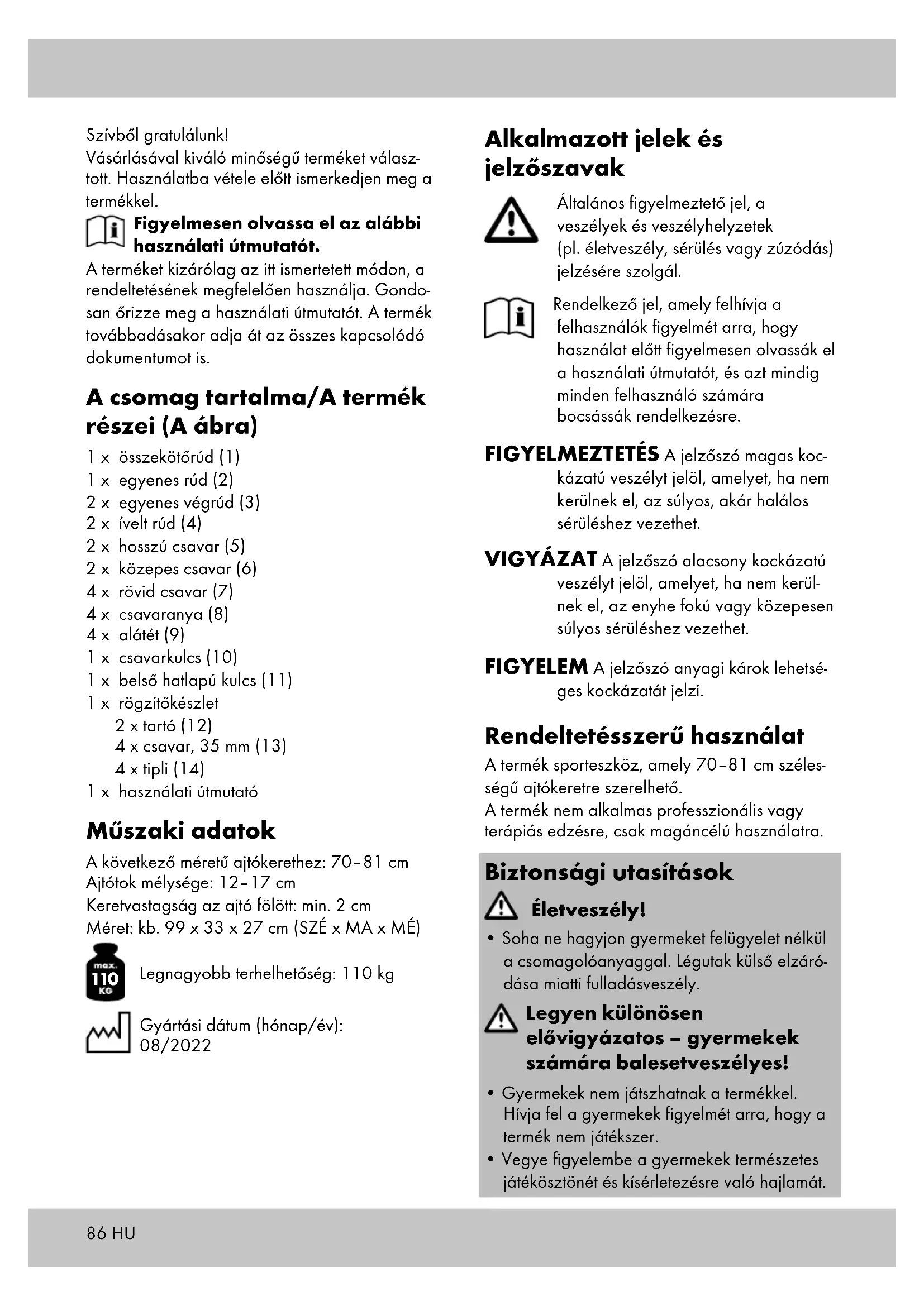 Legnagyobb terhelhetőség: 110 kg Gyártási dátum (hónap/év): 08/2022 Alkalmazott jelek és jelzőszavak Általános figyelmeztető jel, a veszélyek és veszélyhelyzetek (pl. életveszély, sérülés vagy zúzódás) jelzésére szolgál. Rendelkező jel, amely felhívja a felhasználók figyelmét arra, hogy használat előtt figyelmesen olvassák el a használati útmutatót, és azt mindig minden felhasználó számára bocsássák rendelkezésre. FIGYELMEZTETÉS A jelzőszó magas koc- kázatú veszélyt jelöl, amelyet, ha nem kerülnek el, az súlyos, akár halálos sérüléshez vezethet. VIGYÁZAT A jelzőszó alacsony kockázatú veszélyt jelöl, amelyet, ha nem kerül- nek el, az enyhe fokú vagy közepesen súlyos sérüléshez vezethet. FIGYELEM A jelzőszó anyagi károk lehetsé- ges kockázatát jelzi. Rendeltetésszerű használat A termék sporteszköz, amely 70–81 cm széles- ségű ajtókeretre szerelhető. A termék nem alkalmas professzionális vagy terápiás edzésre, csak magáncélú használatra. Biztonsági utasítások Életveszély!
