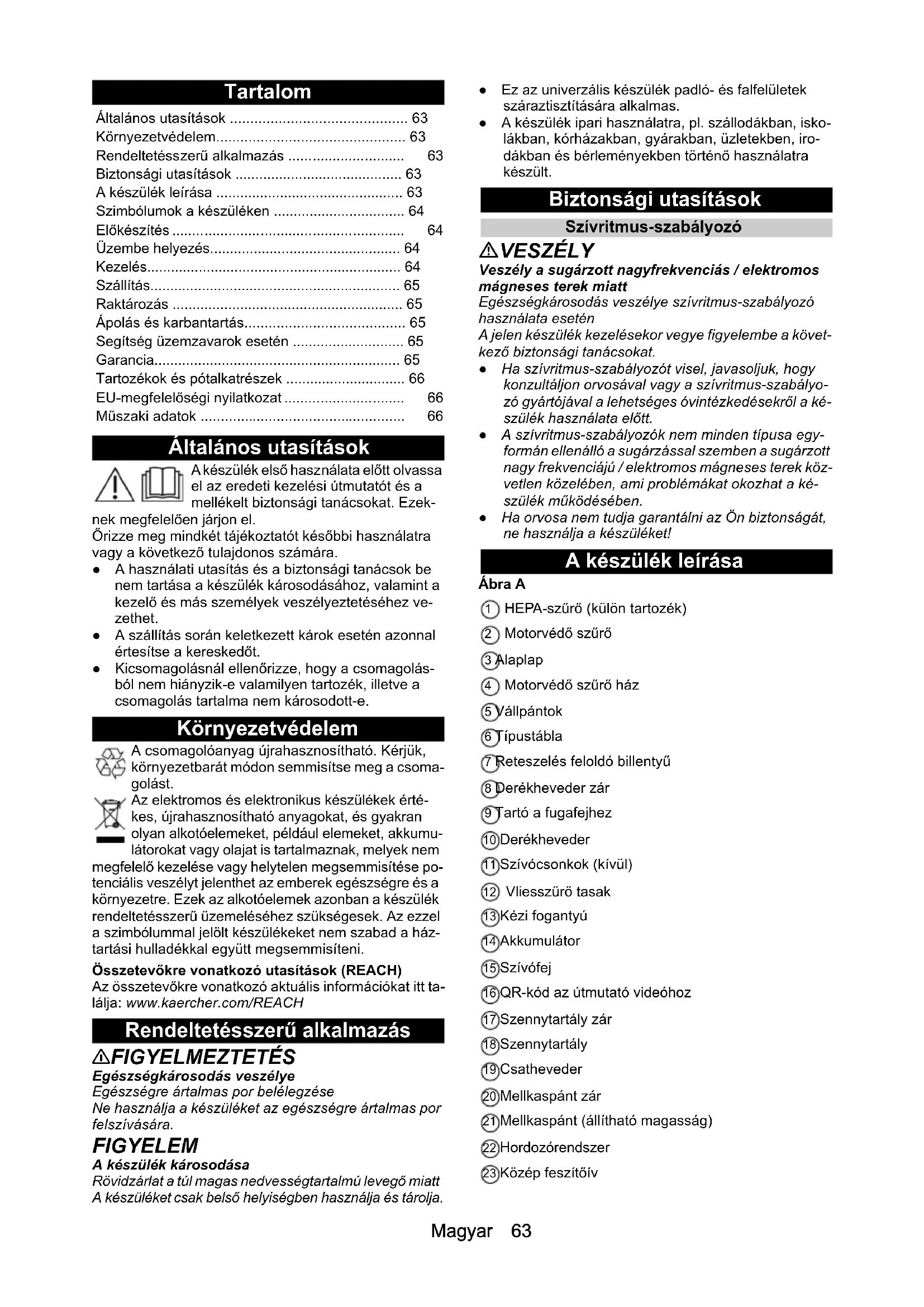 - 0,2Magyar 63 Tartalom Általános utasítások A készülék első használata előtt olvassa el az eredeti kezelési útmutatót és a mellékelt biztonsági tanácsokat. Ezek- nek megfelelően járjon el. Őrizze meg mindkét tájékoztatót későbbi használatra vagy a következő tulajdonos számára. ● A használati utasítás és a biztonsági tanácsok be nem tartása a készülék károsodásához, valamint a kezelő és más személyek veszélyeztetéséhez ve- zethet. ● A szállítás során keletkezett károk esetén azonnal értesítse a kereskedőt. ● Kicsomagolásnál ellenőrizze, hogy a csomagolás- ból nem hiányzik-e valamilyen tartozék, illetve a csomagolás tartalma nem károsodott-e. Környezetvédelem A csomagolóanyag újrahasznosítható. Kérjük, környezetbarát módon semmisítse meg a csoma- golást. Az elektromos és elektronikus készülékek érté- kes, újrahasznosítható anyagokat, és gyakran olyan alkotóelemeket, például elemeket, akkumu- látorokat vagy olajat is tartalmaznak, melyek nem megfelelő kezelése vagy helytelen megsemmisítése po- tenciális veszélyt jelenthet az emberek egészségre és a környezetre. Ezek az alkotóelemek azonban a készülék rendeltetésszerű üzemeléséhez szükségesek. Az ezzel a szimbólummal jelölt készülékeket nem szabad a ház- tartási hulladékkal együtt megsemmisíteni. Összetevőkre vonatkozó utasítások (REACH) Az összetevőkre vonatkozó aktuális információkat itt ta- lálja: www.kaercher.com/REACH Rendeltetésszerű alkalmazás 몇 FIGYELMEZTETÉS Egészségkárosodás veszélye Egészségre ártalmas por belélegzése Ne használja a készüléket az egészségre ártalmas por felszívására. FIGYELEM A készülék károsodása Rövidzárlat a túl magas nedvességtartalmú levegő miatt A készüléket csak belső helyiségben használja és tárolja. ● Ez az univerzális készülék padló- és falfelületek száraztisztítására alkalmas. ● A készülék ipari használatra, pl. szállodákban, isko- lákban, kórházakban, gyárakban, üzletekben, iro- dákban és bérleményekben történő használatra készült. Biztonsági utasítások Szívritmus-szabályozó VESZÉLY Veszély a sugárzott nagyfrekvenciás / elektromos mágneses terek miatt Egészségkárosodás veszélye szívritmus-szabályozó használata esetén A jelen készülék kezelésekor vegye figyelembe a követ- kező biztonsági tanácsokat. ● Ha szívritmus-szabályozót visel, javasoljuk, hogy konzultáljon orvosával vagy a szívritmus-szabályo- zó gyártójával a lehetséges óvintézkedésekről a ké- szülék használata előtt. ● A szívritmus-szabályozók nem minden típusa egy- formán ellenálló a sugárzással szemben a sugárzott nagy frekvenciájú / elektromos mágneses terek köz- vetlen közelében, ami problémákat okozhat a ké- szülék működésében. ● Ha orvosa nem tudja garantálni az Ön biztonságát, ne használja a készüléket! A készülék leírása Ábra A 1 HEPA-szűrő (külön tartozék) 2 Motorvédő szűrő 3 Alaplap 4 Motorvédő szűrő ház 5 Vállpántok 6 Típustábla 7 Reteszelés feloldó billentyű 8 Derékheveder zár 9 Tartó a fugafejhez 10 Derékheveder 11 Szívócsonkok (kívül) 12 Vliesszűrő tasak 13 Kézi fogantyú 14 Akkumulátor 15 Szívófej 16 QR-kód az útmutató videóhoz 17 Szennytartály zár 18 Szennytartály 19 Csatheveder 20 Mellkaspánt zár 21 Mellkaspánt (állítható magasság) 22 Hordozórendszer 23 Közép feszítőív Általános utasítások p. 63