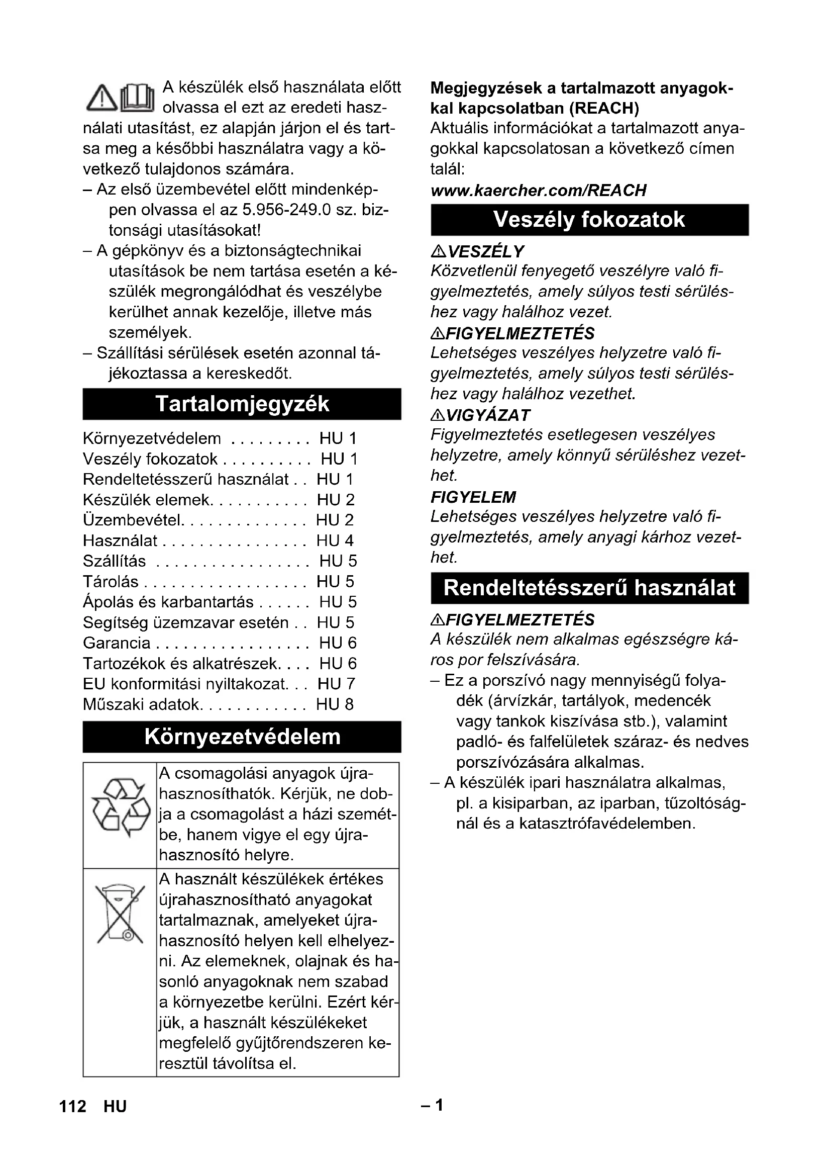 Eltávolító- ill. tisztítóüzem Az előszűrő leürítése A készülék kikapcsolása Minden üzem után A készülék tárolása 115HU– 5 몇 VIGYÁZAT Sérülés- és rongálódásveszély! Szállítás esetén vegye figyelembe a készülék súlyát. A készüléket hordáskor a hordófogan- tyúnál és a szívócsőnél fogja meg. Járművel történő szállítás esetén a ké- szüléket az adott irányelveknek megfe- lelően kell csúszás és borulás ellen biz- tosítani. 몇 VIGYÁZAT Sérülés- és rongálódásveszély! Tárolás esetén vegye figyelembe a készülék súlyát. Ezt a készüléket csak beltéri helyiségben szabad tárolni. VESZÉLY A készüléken történő bármiféle munka előtt kapcsolja ki a készüléket és húzza ki a há- lózati csatlakozót. Nyissa ki a szűrőfedelet. A durva szennyeződés szűrőt/össze- hajtható szűrőt vagy a távozó levegő szűrőt cserélje ki. Zárja be a szűrőfedelet, amelynek hall- hatóan helyére kell kattannia. Oldja ki és vegye le szívófejet. Vegye ki a mentesítő szivattyú kábeltar- tóját. Húzza le az előszűrőt a szívócsonkon keresztül és vegye le. Az előszűrőt tisztítani. Behelyezéskor addig tolja a szívócson- kot, míg az a tartály faláig nem ér. Helyezze be a mentesítő szivattyú ká- beltartóját. Helyezze vissza és biztosítsa a szívófe- jet. Oldja ki és vegye le szívófejet. Az úszót ronggyal megtisztítani. Helyezze vissza és biztosítsa a szívófe- jet. VESZÉLY A készüléken történő bármiféle munka előtt kapcsolja ki a készüléket és húzza ki a há- lózati csatlakozót. Addig tolja a szívócsonkot, míg az a tar- tály faláig nem ér. Ellenőriztesse a dugalj áramellátását egy elektromos szakemberrel. A készülék hálózati csatlakozóját csat- lakoztassa egy másik áramkör másik dugalájhoz. Értesítse a szervizt. Értesítse a szervizt. A dugaljat és az áramellátás biztosíté- kát ellenőrizni. A készülék hálózati kábelét és hálózati csatlakozóját ellenőrizni. Nyomja meg a védőkapcsoló bekap- csoló gombját. Kapcsolja be a készüléket. Ellenőrizze az úszót. Kapcsolja be a vízelvezető szivattyút. Szállítás Tárolás Ápolás és karbantartás A durva szennyeződés szűrő/ összehajtható szűrő vagy a távozó levegő szűrő cseréje Az előszűrő tisztítása Úszó tisztítása Segítség üzemzavar esetén A szívófej nem helyezhető fel A védőkapcsolót nem lehet bekapcsolni A védőkapcsoló a porszívó bekapcsolásakor ismételten kikapcsol A szívóturbina nem megy A szívóturbina kikapcsolódik 116 HU– 6 Távolítsa el a dugulásokat a szívófúvó- kából, szívócsőből, szívótömlőből vagy a durva szennyeződés szűrőből/össze- hajtható szűrőből. Cserélje ki a papír vagy textil porzsákot. Kattintsa be helyesen a szűrőfedelet. A membránszűrőt folyóvíz alatt tisztítsa ill. cserélje ki. Cserélje ki az összehajtható szűrőt. Ellenőrizze a leeresztő tömlő vízzáró- ságát. Ürítse le/tisztítsa meg az előszűrőt. Ellenőrizze, hogy az összehajtható szű- rő helyesen van-e behelyezve. Ellenőrizze, hogy a durva szennyező- dés szűrő helyesen van-e behelyezve. Helyezze be az összehajtható szűrőt. Ellenőrizze, hogy az összehajtható szű- rő helyesen van-e behelyezve. Cserélje ki az összehajtható szűrőt. Ellenőrizze a készülék dugalját. Szabadítsa ki a beszorult úszókapcso- lót a tartályban. Szabadítsa ki a beszorult szivattyú futó- kereket a szivattyúban. A vízelvezető tömlőt megtörés mente- sen fektesse le. Ellenőrizze, hogy nincs-e eldugulva a vízelvezető tömlő. Ha a hibát nem lehet elhárítani, akkor a készüléket a szervizzel kell ellenőriztet- ni. Minden országban az illetékes forgalma- zónk által kiadott garancia feltételek érvé- nyesek. Az esetleges üzemzavarokat az Ön készülékén a garancia lejártáig költség- mentesen elhárítjuk, amennyiben anyag- vagy gyártási hiba az oka. Garanciális eset- ben kérjük, forduljon a vásárlást igazoló bi- zonylattal kereskedőjéhez vagy a legköze- lebbi hivatalos szakszervizhez. Kizárólag eredeti tartozékokat és eredeti pótalkatrészeket alkalmazzon, mivel ezek szavatolják a készülék biztonságos és za- varmentes üzemét. A tartozékokkal és pótalkatrészekkel kap- csolatos információkat a www.kaercher.com oldalon olvashatja. Szívóerő alábbhagy Porkilépés száraz porszívózás esetén A vízelvezető szivattyú nem jár A vízelvezető szivattyú túl keveset szállít Szerviz Garancia Tartozékok és alkatrészek 117HU– 7 Ezennel tanúsítjuk, hogy az alábbiakban megnevezett gép tervezése és építési módja alapján az általunk forgalomba ho- zott kivitelben megfelel az EU irányelvek vonatkozó, alapvető biztonsági és egész- ségügyi követelményeinek. A gép jóváha- gyásunk nélkül történő módosítása esetén ez a nyilatkozat elveszti érvényességet. A készülék megfelel az EU-ban és Magyaror- szágon (HU) harmonizált szabványoknak. 5.957-602 Alulírottak az ügyvezetés megbízásából és felhatalmazásával lépnek fel. A dokumentációért felelős személy: S. Reiser Alfred Kärcher GmbH & Co. KG Alfred-Kärcher-Str. 28 - 40 71364 Winnenden (Germany) Tel.: +49 7195 14-0 Fax: +49 7195 14-2212 Winnenden, 2017/01/01 EU konformitási nyiltakozat Termék: Nedves- és szárazporszívó Típus: 1.146-xxx Vonatkozó európai közösségi irányel- vek: 2006/42/EK (+2009/127/EK) 2014/30/EU 2011/65/ЕU Alkalmazott harmonizált szabványok: EN 55014–1: 2006+A1: 2009+A2: 2011 EN 55014–2: 2015 EN 60335–1 EN 60335–2–69 EN 61000–3–2: 2014 EN 61000–3–3: 2013 EN 62233: 2008 EN 50581 Alkalmazott összehangolt normák: