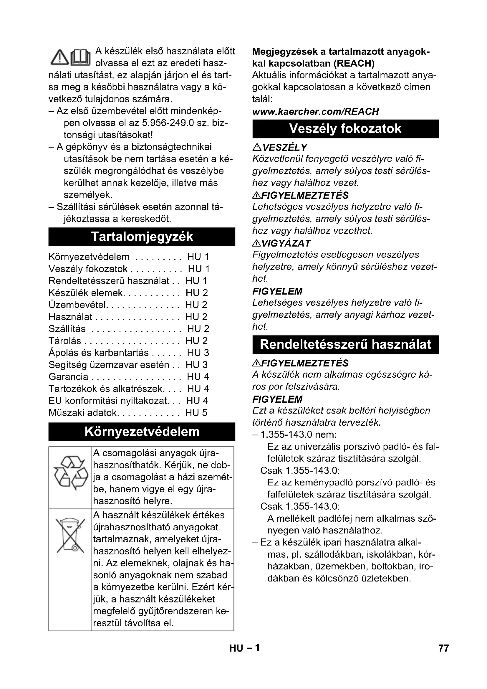 EU 6.650-622.0 12 м GB 6.650-641.0 12 м CH 6.650-638.0 12 м 76 RU– 1 A készülék első használata előtt olvassa el ezt az eredeti hasz- nálati utasítást, ez alapján járjon el és tart- sa meg a későbbi használatra vagy a kö- vetkező tulajdonos számára. – Az első üzembevétel előtt mindenkép- pen olvassa el az 5.956-249.0 sz. biz- tonsági utasításokat! – A gépkönyv és a biztonságtechnikai utasítások be nem tartása esetén a ké- szülék megrongálódhat és veszélybe kerülhet annak kezelője, illetve más személyek. – Szállítási sérülések esetén azonnal tá- jékoztassa a kereskedőt. Megjegyzések a tartalmazott anyagok- kal kapcsolatban (REACH) Aktuális információkat a tartalmazott anya- gokkal kapcsolatosan a következő címen talál: www.kaercher.com/REACH VESZÉLY Közvetlenül fenyegető veszélyre való fi- gyelmeztetés, amely súlyos testi sérülés- hez vagy halálhoz vezet. 몇 FIGYELMEZTETÉS Lehetséges veszélyes helyzetre való fi- gyelmeztetés, amely súlyos testi sérülés- hez vagy halálhoz vezethet. 몇 VIGYÁZAT Figyelmeztetés esetlegesen veszélyes helyzetre, amely könnyű sérüléshez vezet- het. FIGYELEM Lehetséges veszélyes helyzetre való fi- gyelmeztetés, amely anyagi kárhoz vezet- het. 몇 FIGYELMEZTETÉS A készülék nem alkalmas egészségre ká- ros por felszívására. FIGYELEM Ezt a készüléket csak beltéri helyiségben történő használatra tervezték. – 1.355-143.0 nem: Ez az univerzális porszívó padló- és fal- felületek száraz tisztítására szolgál. – Csak 1.355-143.0: Ez az keménypadló porszívó padló- és falfelületek száraz tisztítására szolgál. – Csak 1.355-143.0: A mellékelt padlófej nem alkalmas sző- nyegen való használathoz. – Ez a készülék ipari használatra alkal- mas, pl. szállodákban, iskolákban, kór- házakban, üzemekben, boltokban, iro- dákban és kölcsönző üzletekben. Tartalomjegyzék Környezetvédelem . . . . . . . . . HU 1 Veszély fokozatok . . . . . . . . . . HU 1 Rendeltetésszerű használat . . HU 1 Készülék elemek. . . . . . . . . . . HU 2 Üzembevétel. . . . . . . . . . . . . . HU 2 Használat . . . . . . . . . . . . . . . . HU 2 Szállítás . . . . . . . . . . . . . . . . . HU 2 Tárolás . . . . . . . . . . . . . . . . . . HU 2 Ápolás és karbantartás . . . . . . HU 3 Segítség üzemzavar esetén . . HU 3 Garancia . . . . . . . . . . . . . . . . . HU 4 Tartozékok és alkatrészek. . . . HU 4 EU konformitási nyiltakozat. . . HU 4 Műszaki adatok. . . . . . . . . . . . HU 5 Környezetvédelem A csomagolási anyagok újra- hasznosíthatók. Kérjük, ne dob- ja a csomagolást a házi szemét- be, hanem vigye el egy újra- hasznosító helyre. A használt készülékek értékes újrahasznosítható anyagokat tartalmaznak, amelyeket újra- hasznosító helyen kell elhelyez- ni. Az elemeknek, olajnak és ha- sonló anyagoknak nem szabad a környezetbe kerülni. Ezért kér- jük, a használt készülékeket megfelelő gyűjtőrendszeren ke- resztül távolítsa el. Veszély fokozatok Rendeltetésszerű használat 77HU– 2 1 Textil porzsák 2 Szívótámasztékok 3 Szívótömlő 4 Típustábla 5 Kábel tartó 6 Fogantyú 7 Hálózati kábel 8 Szívófej 9 Szívófej zárja 10 Kormánygörgő 11 Hulladéktartály 12 Dugalj az elektromos szívókeféhez 13 Főkapcsoló 14 Kemény felület/szőnyegpadló átkap- csoló (felszereléstől függően) 15 Padló szórófej 16 Szívócső 17 Hálózati csatlakozódugó rögzítése 18 A padlószívófej befogója 19 A fedél retesze 20 Borítás 21 Szűrőház 22 Használtlevegő szűrő 23 Szíváserősség szabályozója (fokozat- mentes) 24 Könyökcső 25 Fő szűrőkosár 26 Motorvédő szűrő – A tisztítási folyamat kezelő elemei sár- gák. – A karbantartás és szerviz kezelő elemei világos szürkék. Kontroll, hogy a fő szűrőkosár a készü- lékbe be van-e helyezve. 1 Üzem textil porzsákkal vagy papír por- zsákkal (különleges tartozék) 2 Porzsák nélküli üzem Oldja ki és vegye le szívófejet. Vegye ki a fő szűrőkosarat. A textil porzsákot vagy a papír porzsá- kot (különleges tartozék) felhelyezni. Helyezze be a fő szűrőkosarat. Helyezze vissza és biztosítsa a szívófe- jet. Dugja be a hálózati csatlakozót. A készüléket a főkapcsolón keresztül bekapcsolni. A szívófej átkapcsolóját kemény felület- re vagy szőnyegpadlóra állítani. A szívóerőt a szívásszabályozón ke- resztül beállítani (fokozatmentes). Tisztítás elvégzése. A készüléket a főkapcsolón keresztül kikapcsolni. Húzza ki a hálózati dugót. Ürítse ki a tartályt. A készüléket kívül-belül porszívóval és nedves ronggyal kell megtisztítani. 몇 VIGYÁZAT Sérülés- és rongálódásveszély! Szállítás esetén vegye figyelembe a készülék súlyát. Járművel történő szállítás esetén a ké- szüléket az adott irányelveknek megfe- lelően kell csúszás és borulás ellen biz- tosítani. 몇 VIGYÁZAT Sérülés- és rongálódásveszély! Tárolás esetén vegye figyelembe a készülék súlyát. Ezt a készüléket csak beltéri helyiségben szabad tárolni. Készülék elemek Szín megjelölés Üzembevétel Üzem típusok Szűrőtasak behelyezése Használat A készülék bekapcsolása Tisztítási üzemmód A készülék kikapcsolása Minden üzem után Szállítás Tárolás 78 HU– 3 VESZÉLY A készüléken történő bármiféle munka előtt kapcsolja ki a készüléket és húzza ki a há- lózati csatlakozót. A fő szűrőkosarat (mosható) szükség esetén folyóvíz alatt tisztítani. FIGYELEM Sérülésveszély! A fő szűrőkosarat soha ne helyezze be nedvesen. Használtlevegő szűrő: évente 1x cserél-