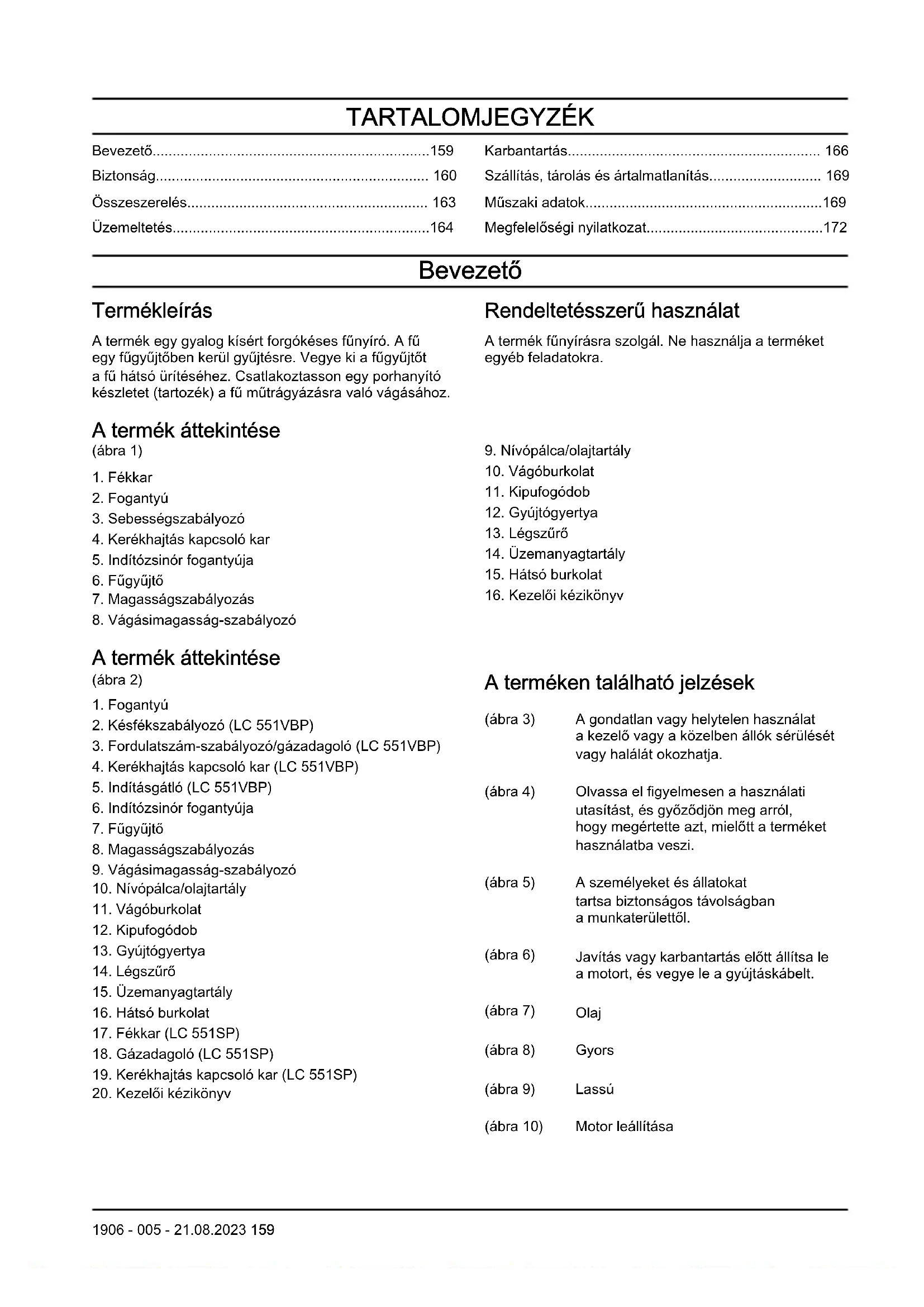 - Megfelelőségi nyilatkozat Bevezető Termékleírás A termék egy gyalog kísért forgókéses fűnyíró. A fű egy fűgyűjtőben kerül gyűjtésre. Vegye ki a fűgyűjtőt a fű hátsó ürítéséhez. Csatlakoztasson egy porhanyító készletet (tartozék) a fű műtrágyázásra való vágásához. Rendeltetésszerű használat A termék fűnyírásra szolgál. Ne használja a terméket egyéb feladatokra. A termék áttekintése (ábra 1) p. 172