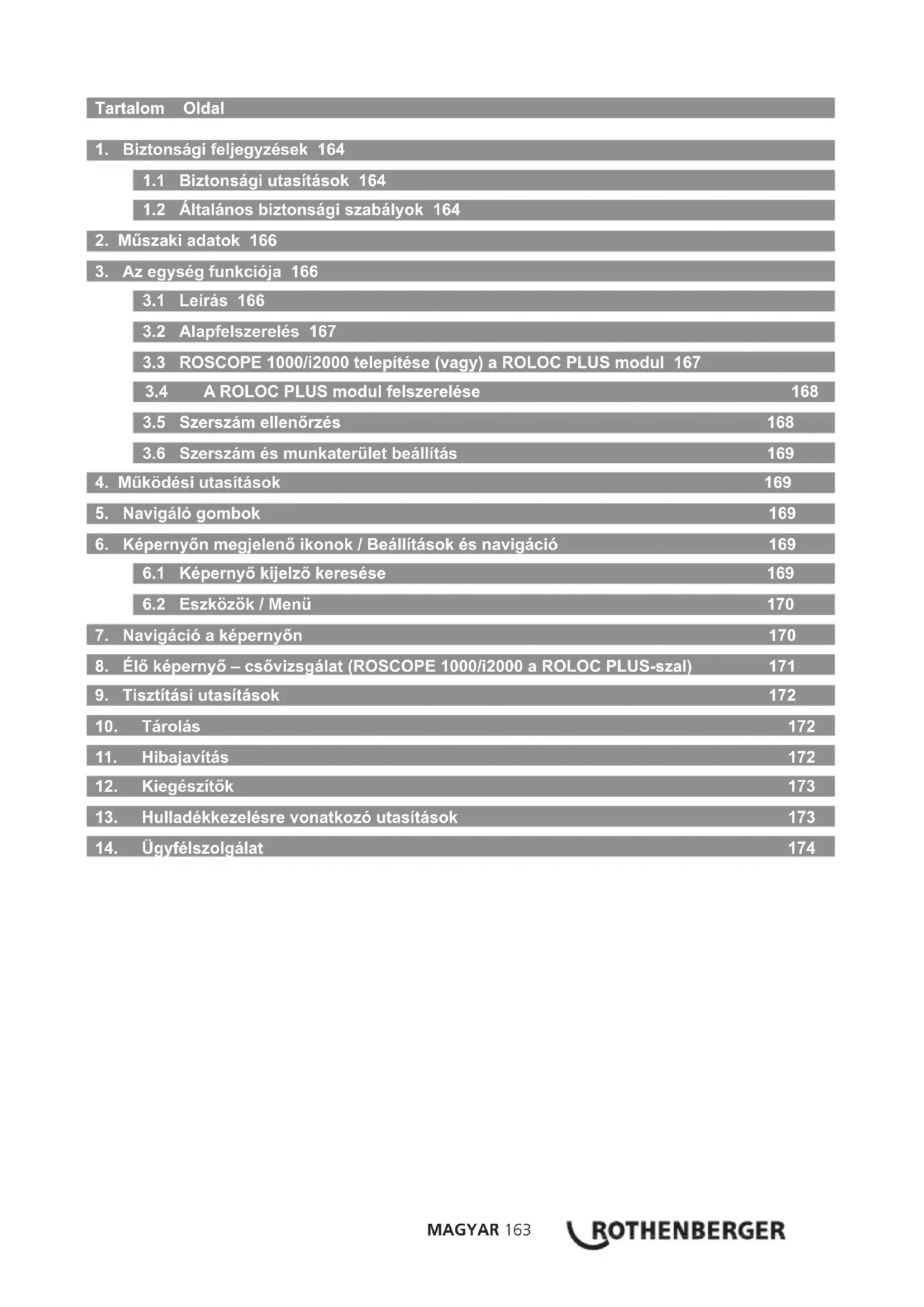 Tünet Lehetséges ok Megoldás A kijelző egység nem kapcsol be Az akkumulátor kisült Akkumulátor újratöltése Ellenőrizze, hogy az akkumulátor akkumulátor rekeszben van Helyezze az akkumulátort az akkumulátor rekeszbe Hibás elektronika Lépjen kapcsolatba a ROTHENBERGER márkaszervizzel A kijelző bekapcsol, de nem mutat képet. Mozgó kábel csatlakozás Ellenőrizze a kábel csatlakozást A kijelző fej koszos Tisztítsa meg a kijelző fejet A kijelző nem megfelelő képet mutat A kép processzor hibát jelez Egység KI/BE kapcsolása a processzor visszaállításához Az akkumulátor nem tölt Az akkumulátor némileg kisülhetett a tárolás során Vegye ki az akkumulátort tároláskor A működési idő a LED használattól függ A LED-ek sűrű használatakor töltse az akkumulátort gyakrabban Az akkumulátor megsérülhetett Cserélje ki az akkumulátort Az akkumulátor élettartama lejárt Cserélje ki az akkumulátort Nincs jel Helytelen frekvencia Ellenőrizze a szonda frekvenciáját, majd állítson be ROLOC frekvenciát a menüben Mélységmérés Ezt mutatja: A ROLOC PLUS tartományon kívül van Ellenőrizze a legerősebb jelet ROSCOPE 1000/i2000 Hibakód 1 “nincs bedugaszolva” Ez a hiba akkor jelentkezik, amikor a képfelvevőt a konnektorra dugaszolták és működött, majd később kihúzták Lépjen kapcsolatba a szervizrészleggelMAGYAR 173 Tünet Lehetséges ok Megoldás ROSCOPE 1000/i2000 Hibakód 2 “Digitális / Nincs videoszinkron” Azt jelzi, hogy a rendszer megtalálta a digitális képfelvevőt, de videoszinkron nincs Lépjen kapcsolatba a szervizrészleggel ROSCOPE 1000/i2000 Hibakód 3 “Analóg / Nincs videoszinkron” Azt jelzi, hogy a rendszer megtalálta az analóg képfelvevőt, de videoszinkron nincs Lépjen kapcsolatba a szervizrészleggel ROSCOPE 1000/i2000 Hibakód 4 (PPI) “Videó adatok nem helyes formátumúak” Azt jelzi, hogy a videó adatok nem a helyes formátumban vannak Lépjen kapcsolatba a szervizrészleggel ROSCOPE 1000/i2000 Hibakód 5 “Aurora érzékelve” Ez olyankor fordul elő, amikor a képfelvevő automatikus korrekciós sémája (csak digitális képfelvevőnél) műtermékeket tartalmazó képet eredményez – majd a képfelvevő alaphelyzetbe áll. Ha a jelenség többszöri újrapróbálkozás után is fennáll, ez a hibaüzenet jelenik meg. Lépjen kapcsolatba a szervizrészleggel ROSCOPE 1000/i2000 Hibakód 6 “Zárlatos vagy szakadt adatvonalak” Öndiagnosztikai hiba, amikor a rendszer tesztábra generálására kongurálja magát majd azt a tesztábrát érvényesíti. Ha az ábra nem helyes, azt jelenti, hogy zárlat vagy szakadás van a videoforrás(ok)tól a főprocesszorhoz vezető adatvonalban. Lépjen kapcsolatba a szervizrészleggel