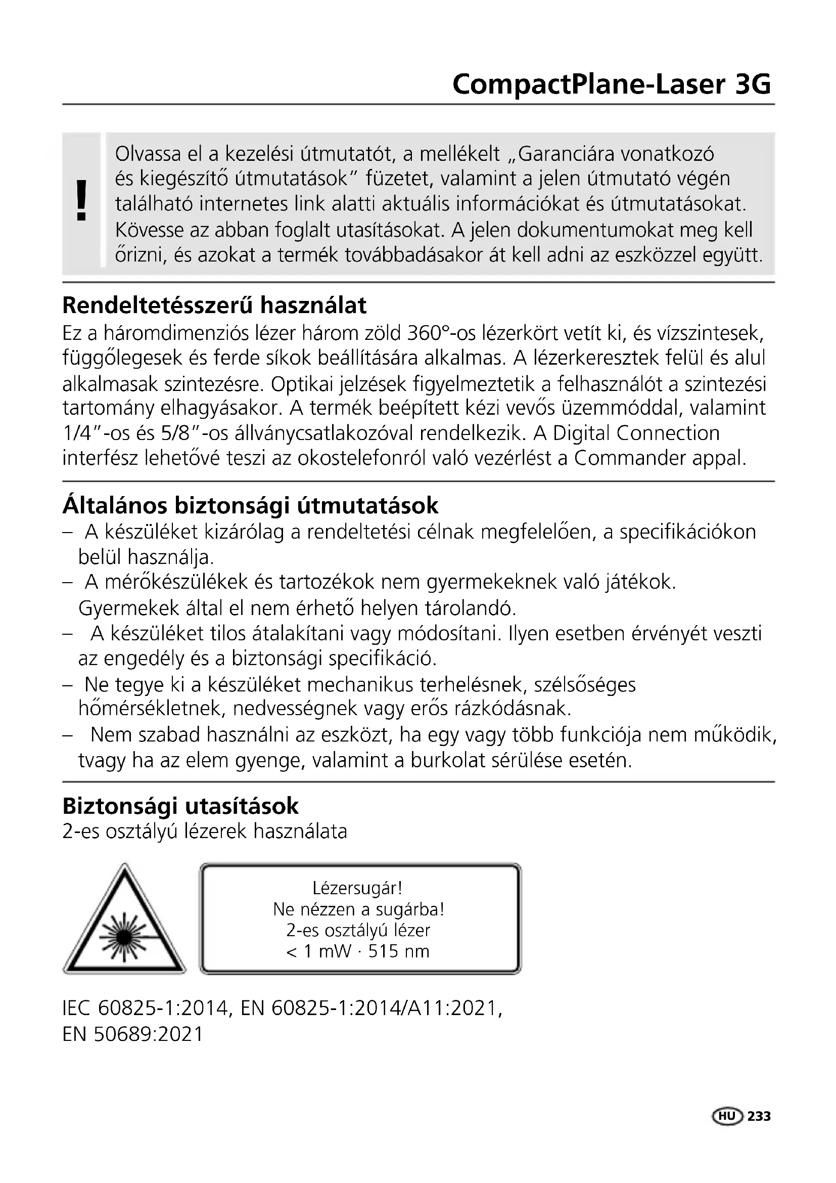 Rendeltetésszerű használat Ez a háromdimenziós lézer három zöld 360°-os lézerkört vetít ki, és vízszintesek, függőlegesek és ferde síkok beállítására alkalmas. A lézerkeresztek felül és alul alkalmasak szintezésre. Optikai jelzések gyelmeztetik a felhasználót a szintezési tartomány elhagyásakor. A termék beépített kézi vevős üzemmóddal, valamint 1/4”-os és 5/8”-os állványcsatlakozóval rendelkezik. A Digital Connection interfész lehetővé teszi az okostelefonról való vezérlést a Commander appal. Általános biztonsági útmutatások – A készüléket kizárólag a rendeltetési célnak megfelelően, a specikációkon belül használja. – A mérőkészülékek és tartozékok nem gyermekeknek való játékok. Gyermekek által el nem érhető helyen tárolandó. – A készüléket tilos átalakítani vagy módosítani. Ilyen esetben érvényét veszti az engedély és a biztonsági specikáció. – Ne tegye ki a készüléket mechanikus terhelésnek, szélsőséges hőmérsékletnek, nedvességnek vagy erős rázkódásnak. – Nem szabad használni az eszközt, ha egy vagy több funkciója nem működik, tvagy ha az elem gyenge, valamint a burkolat sérülése esetén. Biztonsági utasítások 2-es osztályú lézerek használata