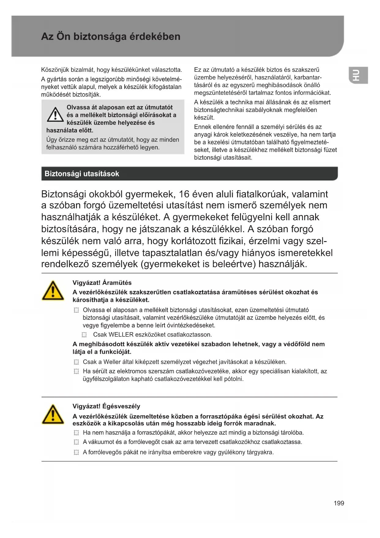 Az Ön biztonsága érdekében Köszönjükbizalmát,hogykészülékünketválasztotta. Agyártássoránalegszigorúbbminőségikövetelmé- nyeketvettükalapul,melyekakészülékkifogástalan működésétbiztosítják. Olvassa át alaposan ezt az útmutatót és a mellékelt biztonsági előírásokat a készülék üzembe helyezése és használata előtt. Úgyőrizzemegeztazútmutatót,hogyazminden felhasználószámárahozzáférhetőlegyen. Ezazútmutatóakészülékbiztosésszakszerű üzembehelyezéséről,használatáról,karbantar- tásárólésazegyszerűmeghibásodásokönálló megszüntetetésérőltartalmazfontosinformációkat. Akészülékatechnikamaiállásánakésazelismert biztonságtechnikaiszabályoknakmegfelelően készült. Ennekellenérefennállaszemélyisérülésésaz anyagikárokkeletkezésénekveszélye,hanemtartja beakezelésiútmutatóbantalálhatógyelmezteté- seket,illetveakészülékhezmellékeltbiztonságifüzet biztonságiutasításait. Biztonsági utasítások Biztonságiokokbólgyermekek,16évenaluliatalkorúak,valamint aszóbanforgóüzemeltetésiutasítástnemismerőszemélyeknem használhatjákakészüléket.Agyermekeketfelügyelnikellannak biztosítására,hogynejátszanakakészülékkel.Aszóbanforgó készüléknemvalóarra,hogykorlátozottzikai,érzelmivagyszel- lemiképességű,illetvetapasztalatlanés/vagyhiányosismeretekkel rendelkezőszemélyek(gyermekeketisbeleértve)használják. Vigyázat! Áramütés A vezérlőkészülék szakszertlen csatlakoztatása áramütéses sérülést okozhat és károsíthatja a készüléket. Olvassaelalaposanamellékeltbiztonságiutasításokat,ezenüzemeltetésiútmutató biztonságiutasításait,valamintvezérlőkészülékeútmutatójátazüzembehelyezéselőtt,és vegyegyelembeabenneleírtóvintézkedéseket. Csak WELLER eszközöket csatlakoztasson. A meghibásodott készülék aktív vezetékei szabadon lehetnek, vagy a védőföld nem látja el a funkcióját. CsakaWelleráltalkiképzettszemélyzetvégezhetjavításokatakészüléken. Hasérültazelektromosszerszámcsatlakozóvezetéke,akkoregyspeciálisankialakított,az ügyfélszolgálatonkaphatócsatlakozóvezetékkelkellpótolni. Vigyázat! Égésveszély A vezérlőkészülék üzemeltetése közben a forrasztópáka égési sérülést okozhat. Az eszközök a kikapcsolás után még hosszabb ideig forrók maradnak. Hanemhasználjaaforrasztópákát,akkorhelyezzeaztmindigabiztonságitárolóba. Avákuumotésaforrólevegőtcsakazarratervezettcsatlakozókhozcsatlakoztassa. Aforrólevegőspákátneirányítsaemberekrevagygyúlékonytárgyakra. HU200