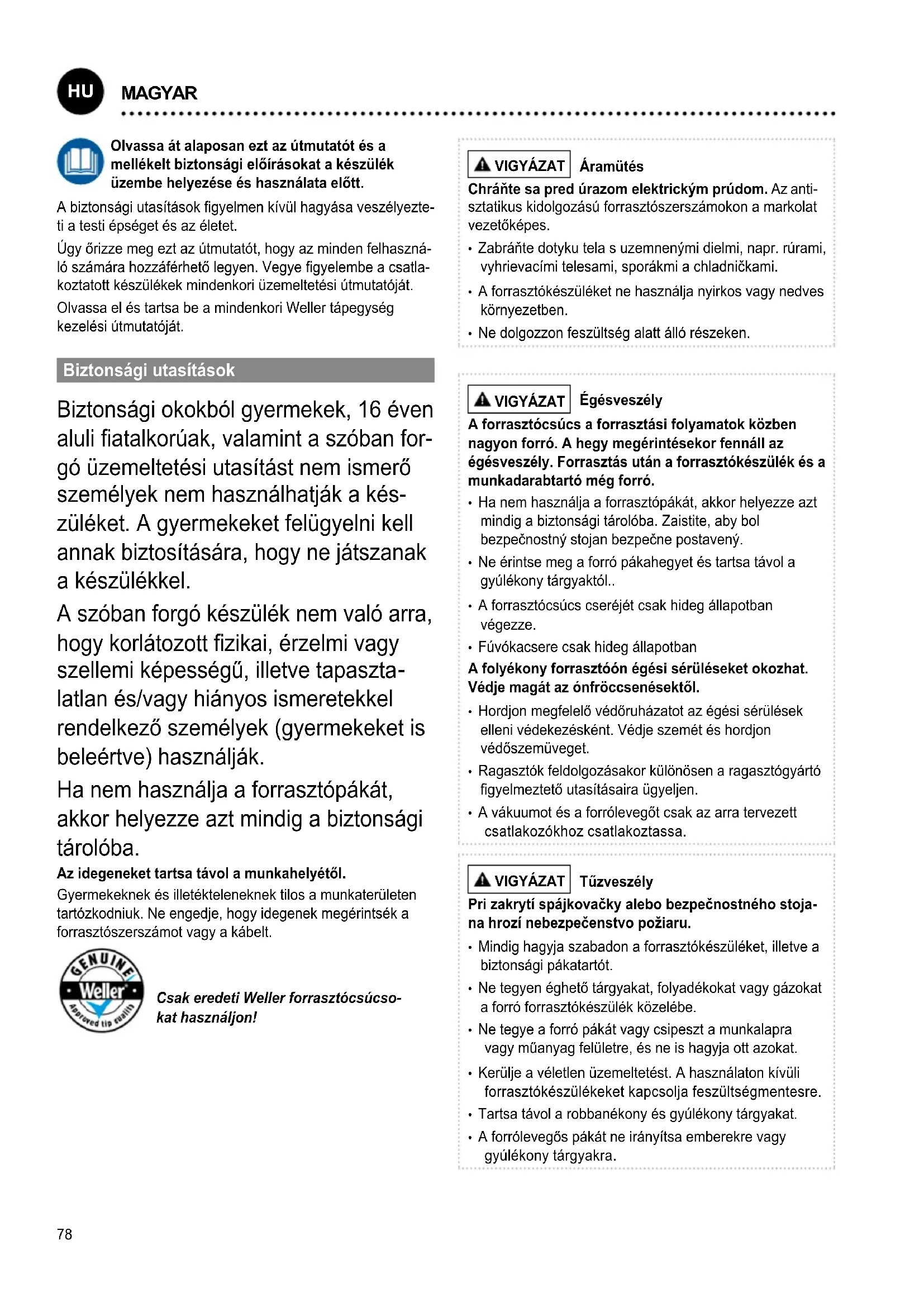 POLSKI78 Olvassa át alaposan ezt az tmutatót és a mellékelt biztonsági előrásokat a készülék üzembe helyezése és használata előtt. A biztonsági utastások gyelmen kvül hagyása veszélyezte- ti a testi épséget és az életet. Úgy őrizze meg ezt az tmutatót, hogy az minden felhaszná- ló számára hozzáférhető legyen. Vegye gyelembe a csatla- koztatott készülékek mindenkori üzemeltetési tmutatóját. Olvassa el és tartsa be a mindenkori Weller tápegység kezelési tmutatóját. Biztonsági utasítások Biztonsági okokból gyermekek, 16 éven aluli atalkorak, valamint a szóban for- gó üzemeltetési utastást nem ismerő személyek nem használhatják a kés- züléket. A gyermekeket felügyelni kell annak biztostására, hogy ne játszanak a készülékkel. A szóban forgó készülék nem való arra, hogy korlátozott zikai, érzelmi vagy szellemi képességű, illetve tapaszta